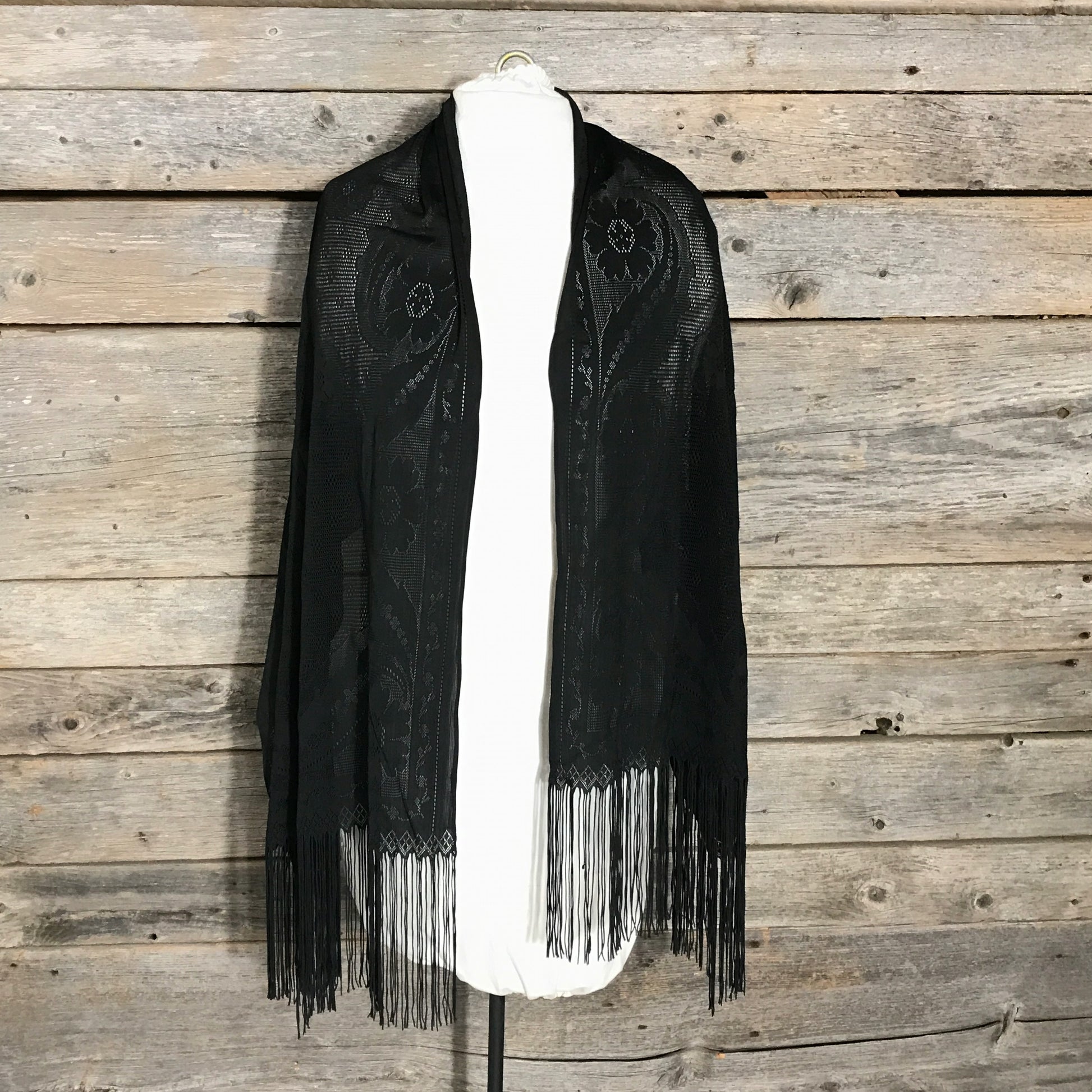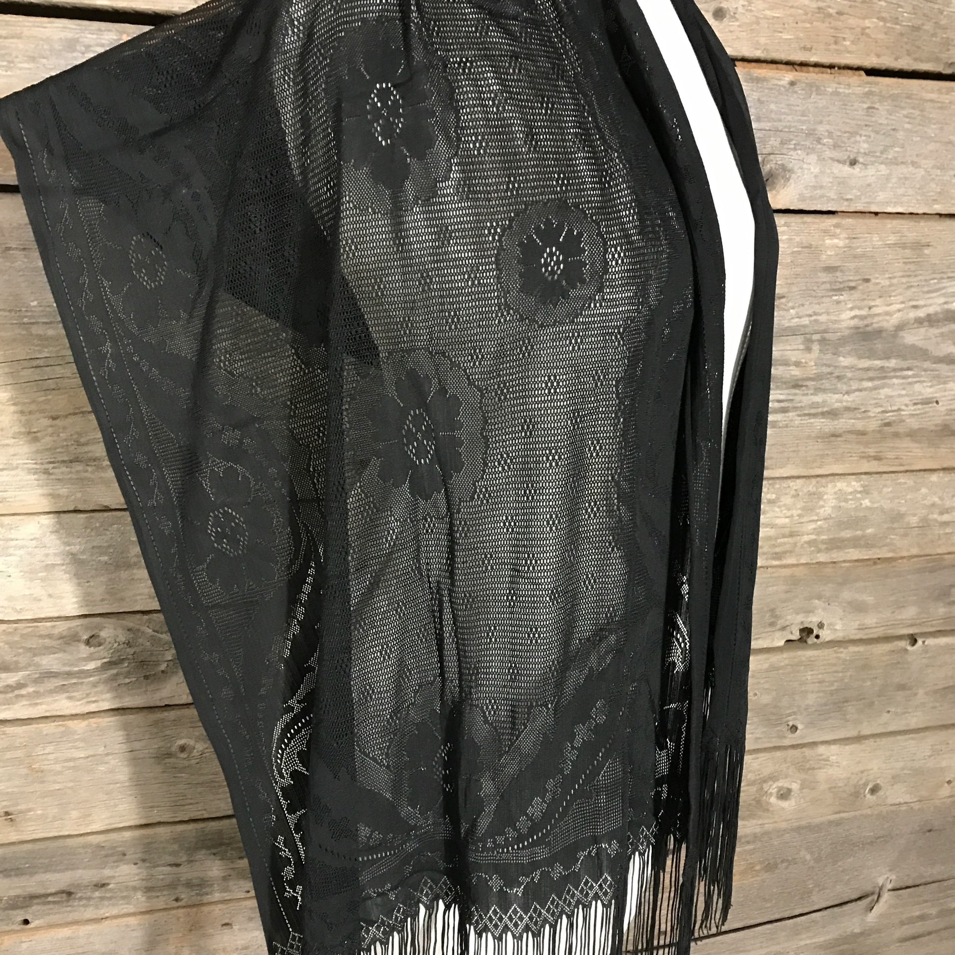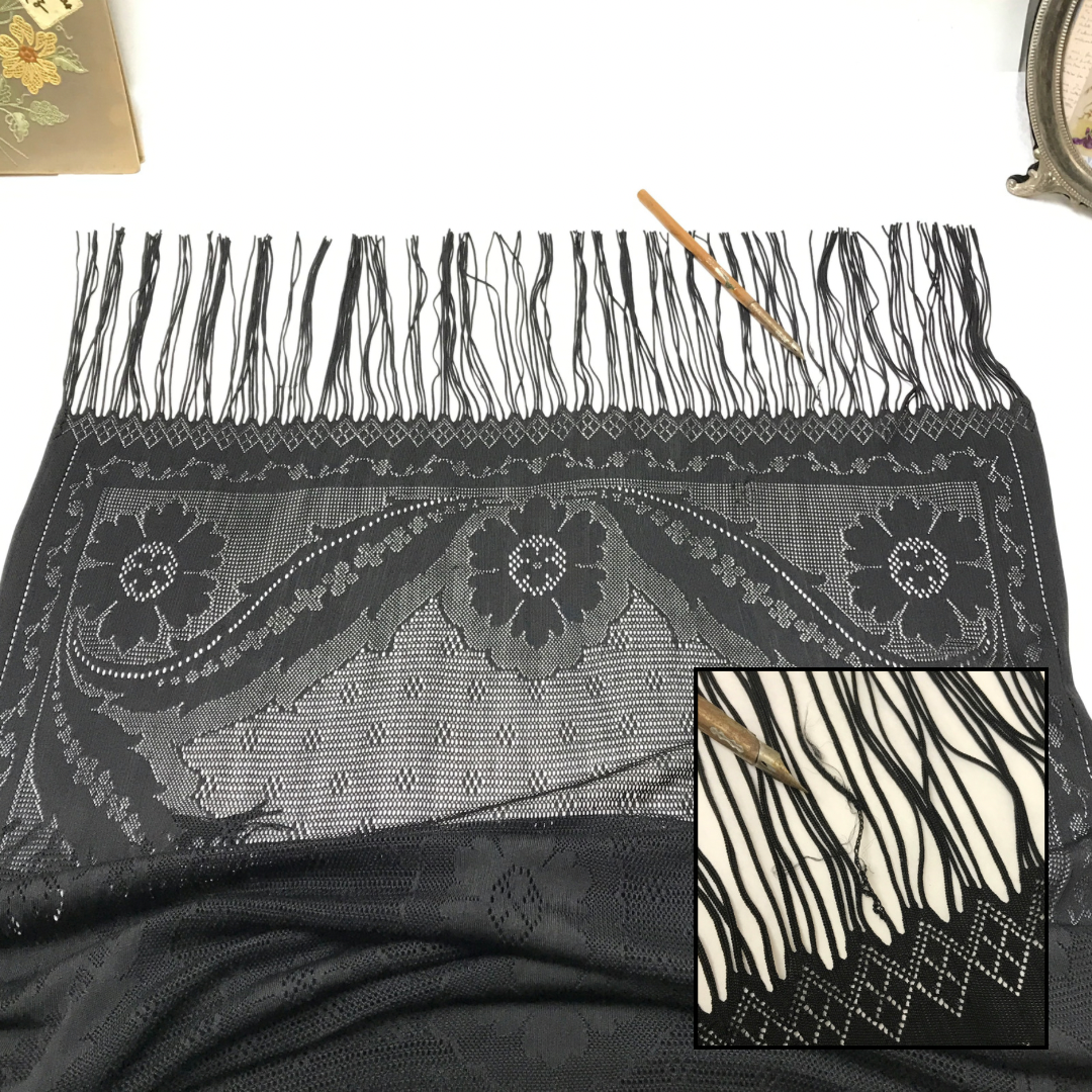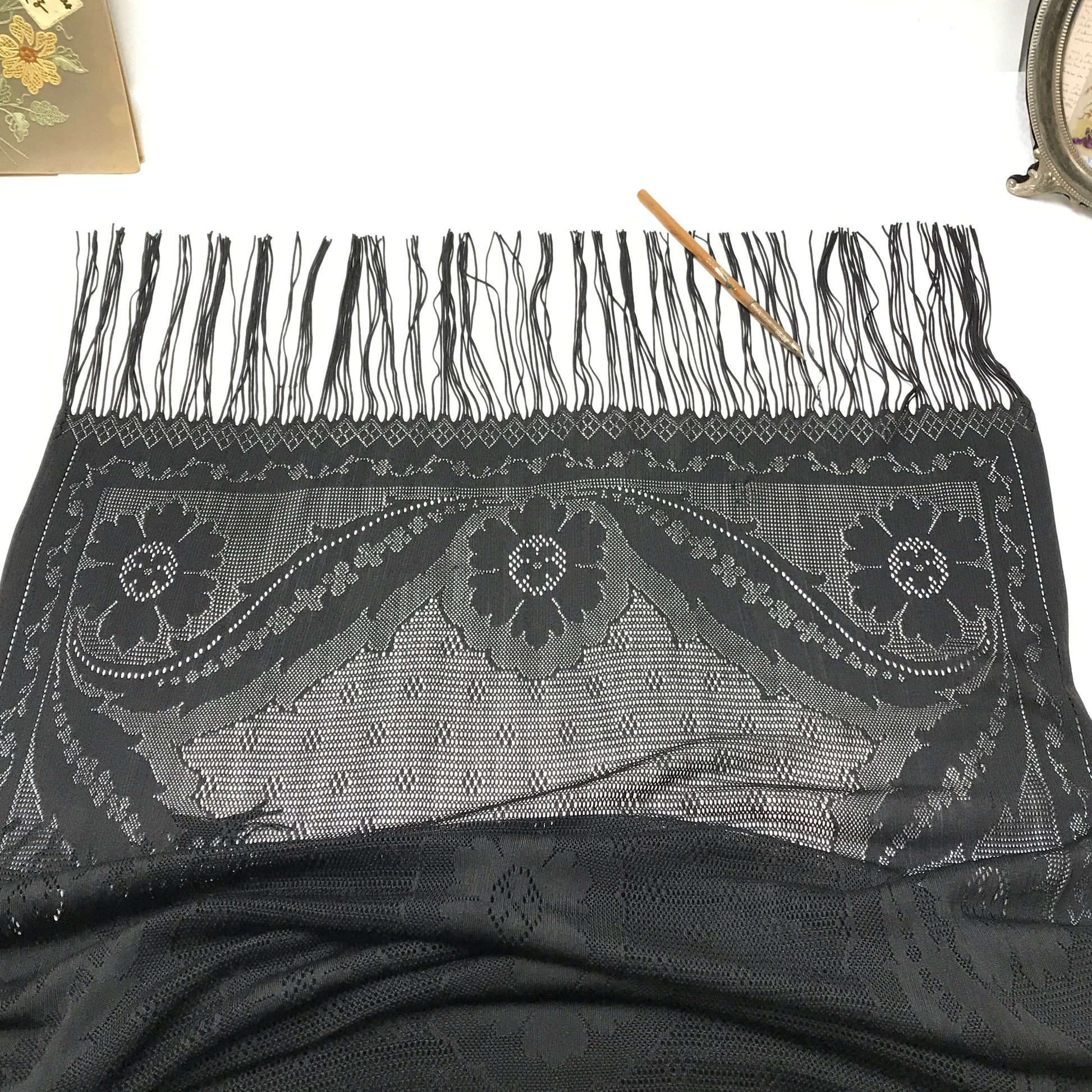 This exquisite black lace shawl features a floral design with a long 5.5 inch fringe at either end. It is a wonderful addition for any collector or student of antique fashion. The piece is in very good condition for its age with some very small faults highlighted below.