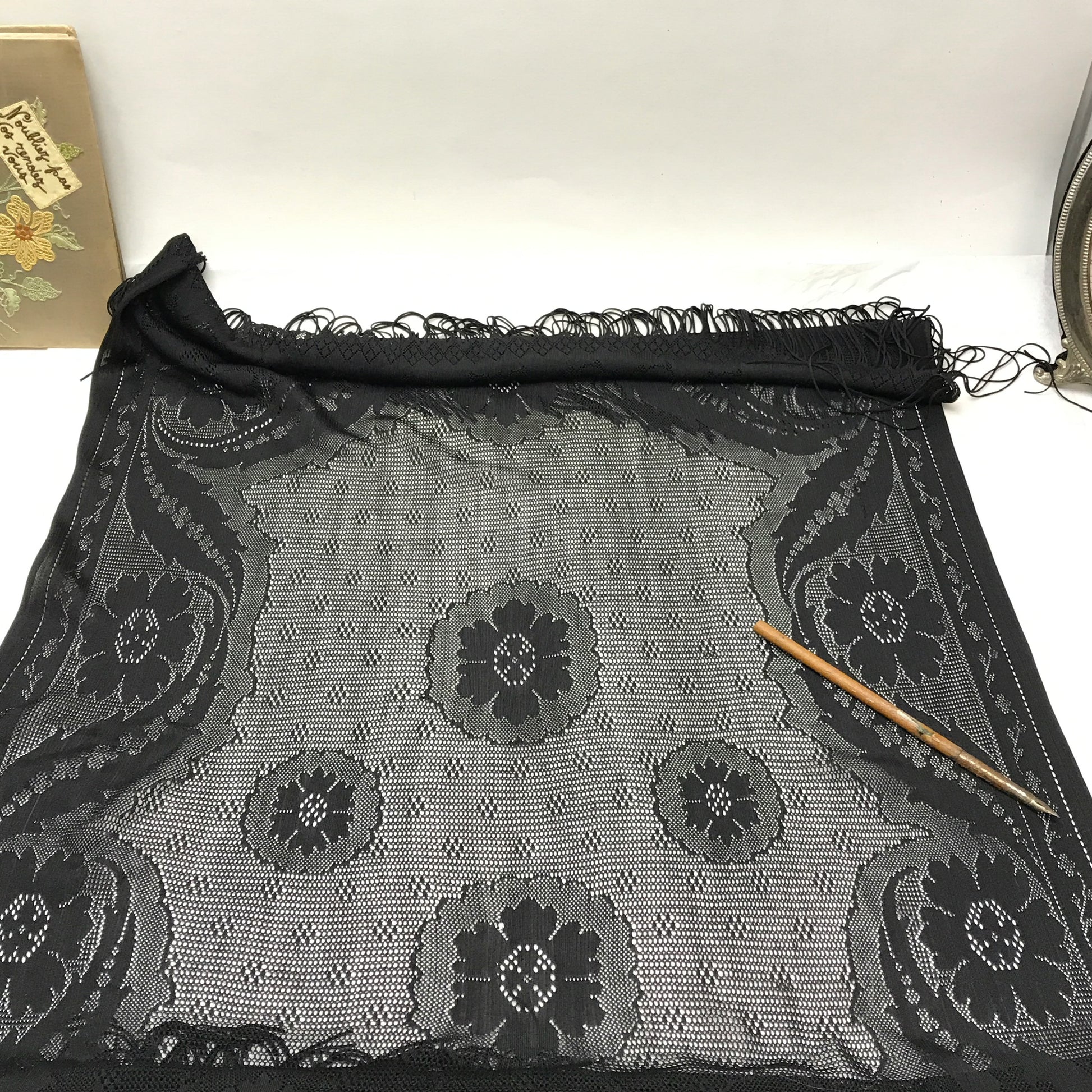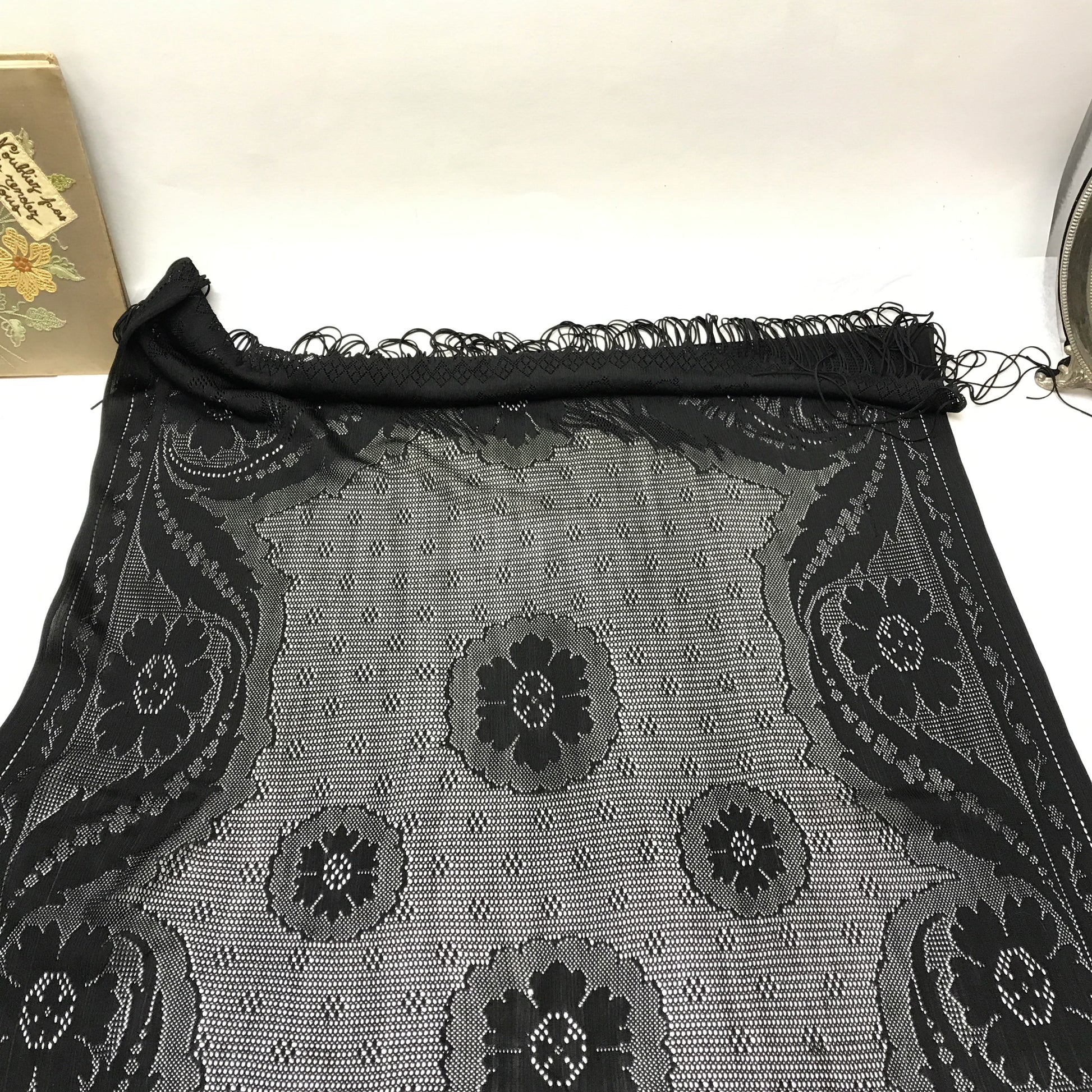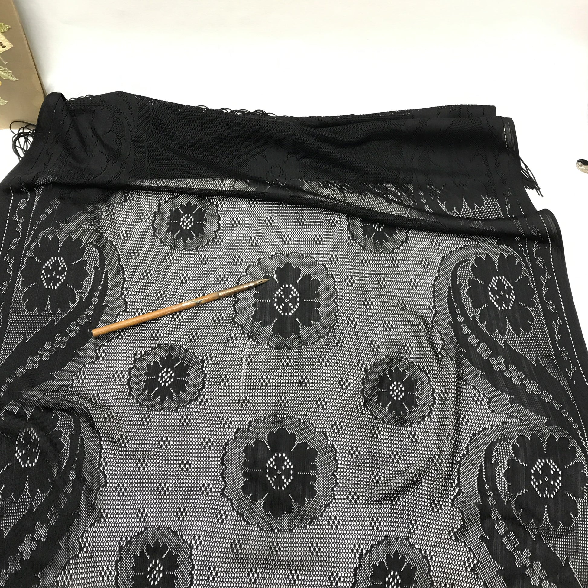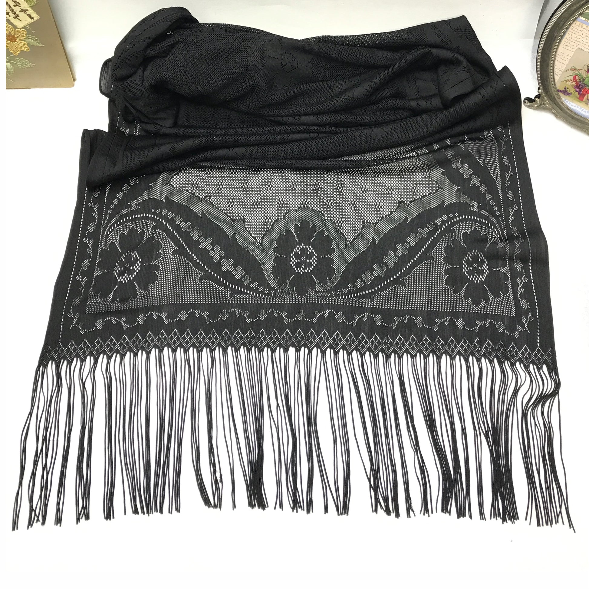 This exquisite black lace shawl features a floral design with a long 5.5 inch fringe at either end. It is a wonderful addition for any collector or student of antique fashion. The piece is in very good condition for its age with some very small faults highlighted below.