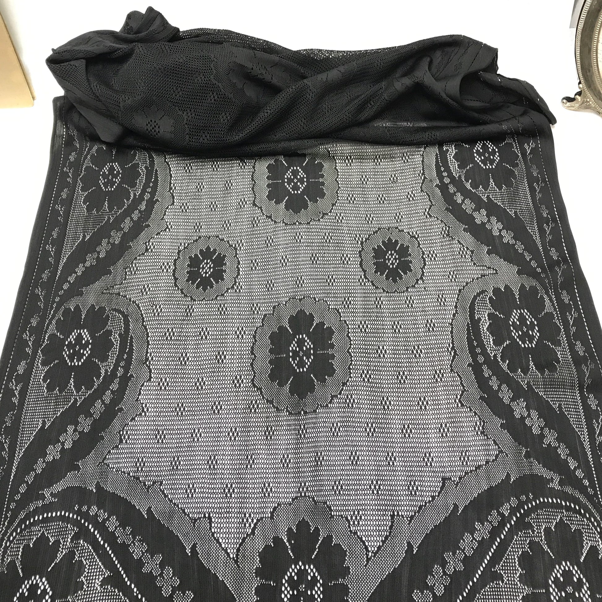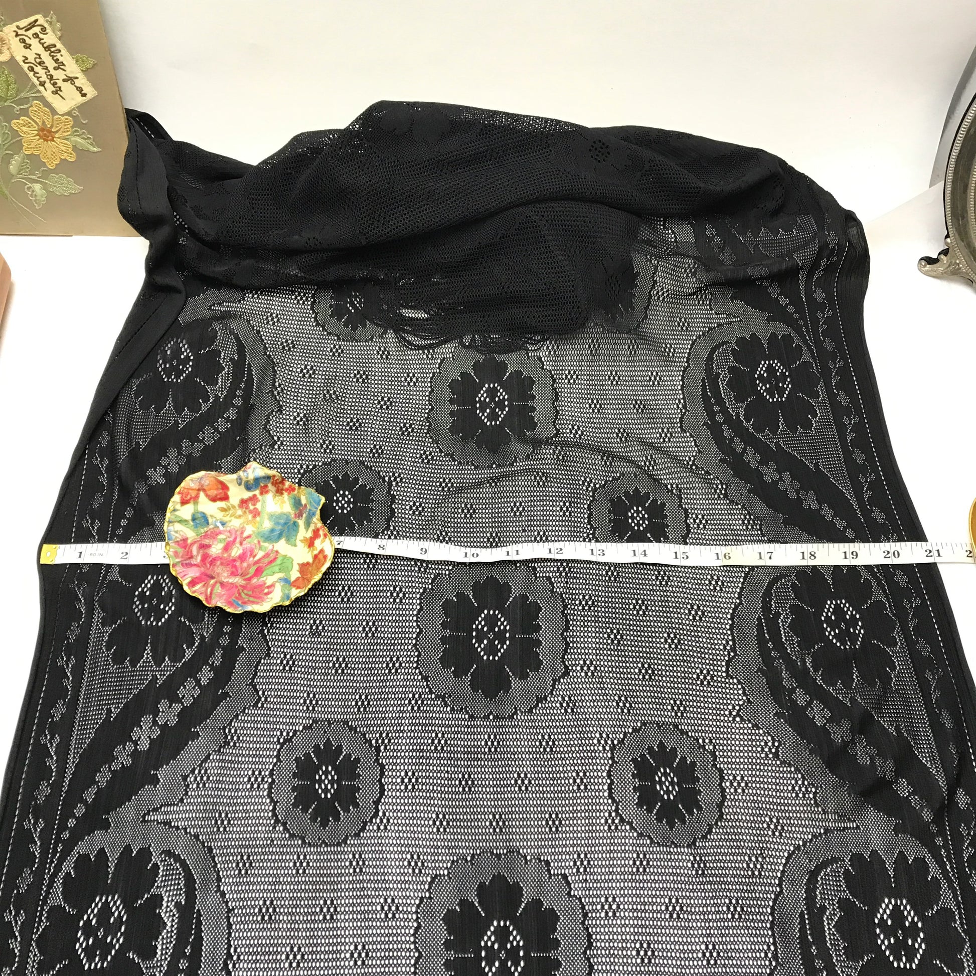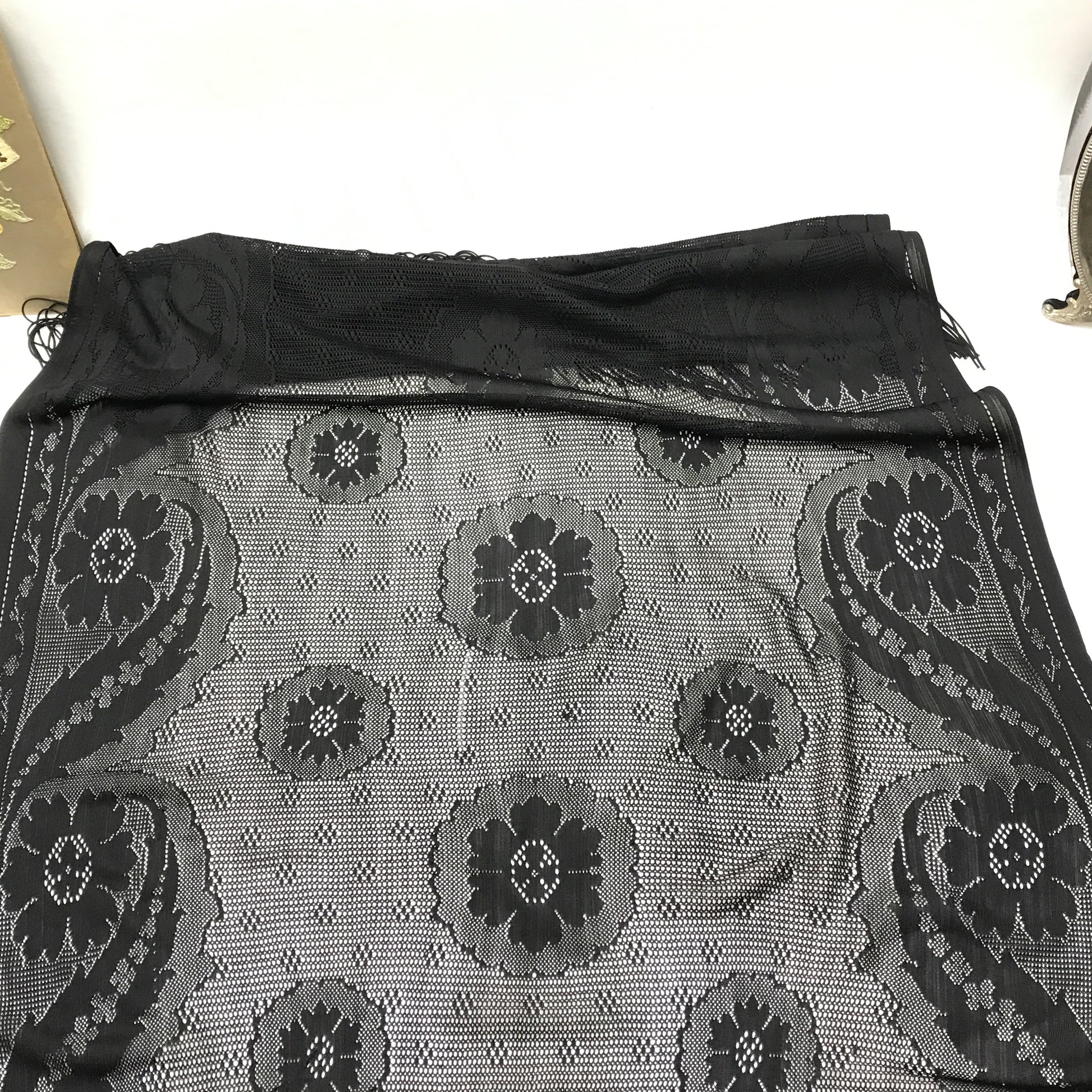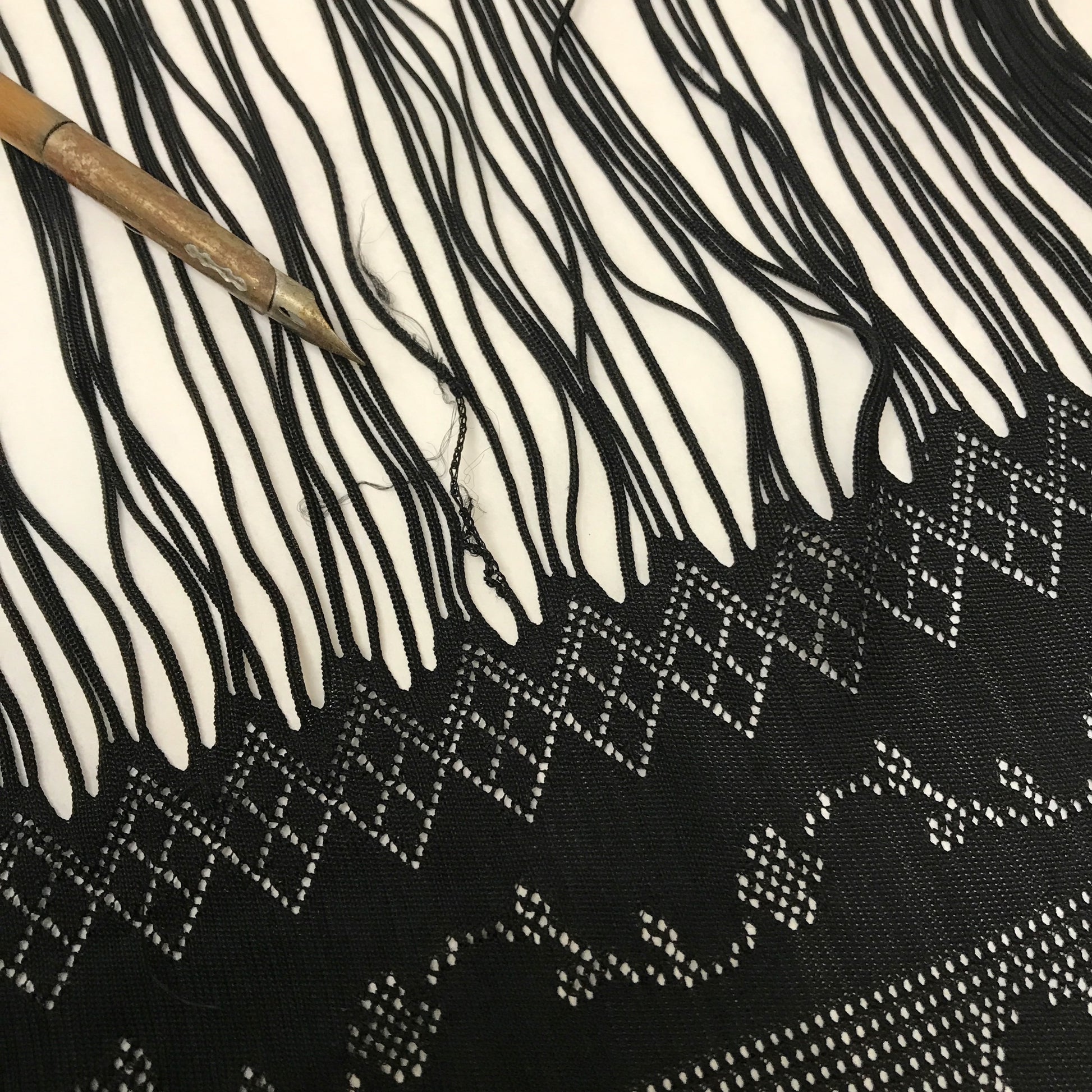 This exquisite black lace shawl features a floral design with a long 5.5 inch fringe at either end. It is a wonderful addition for any collector or student of antique fashion. The piece is in very good condition for its age with some very small faults highlighted below.