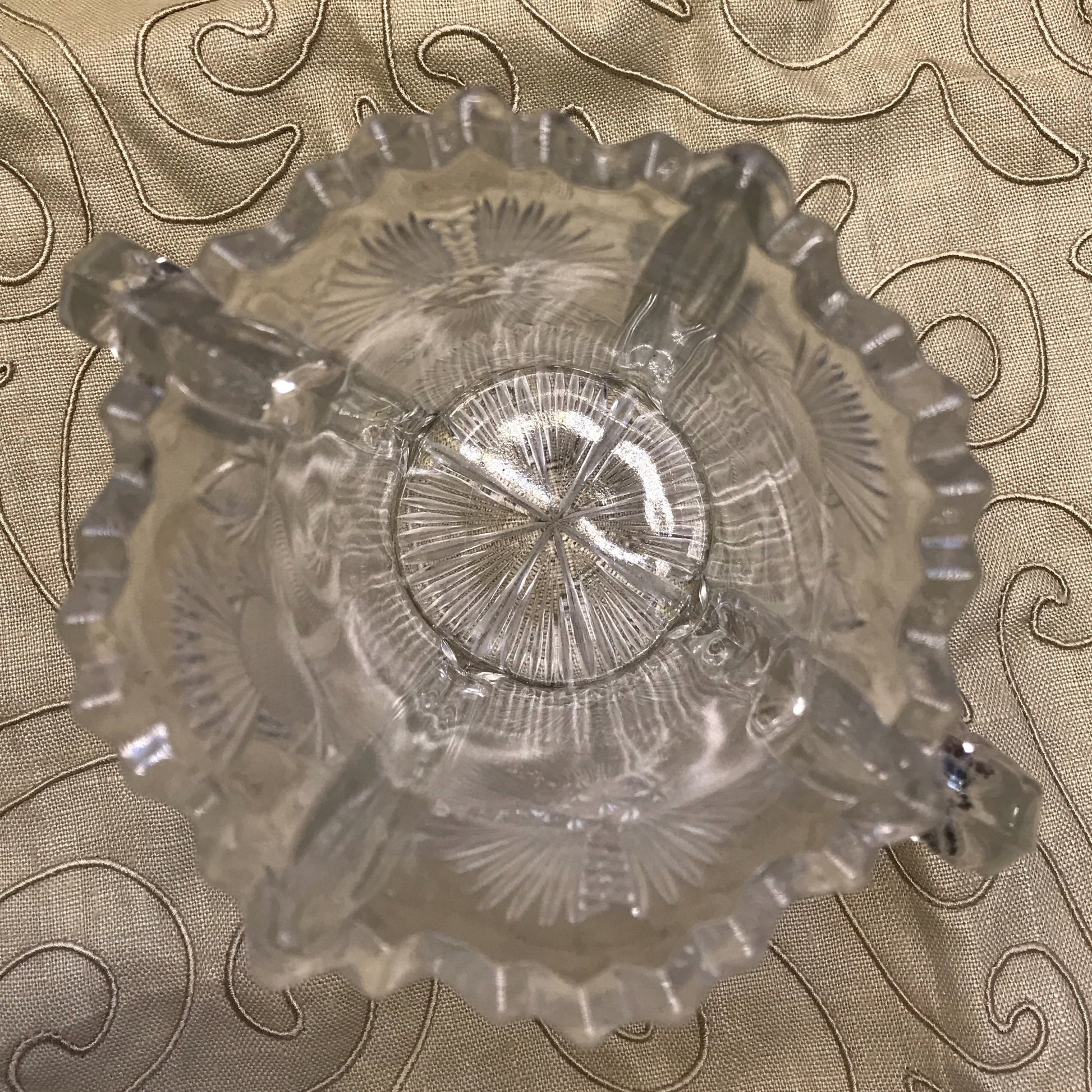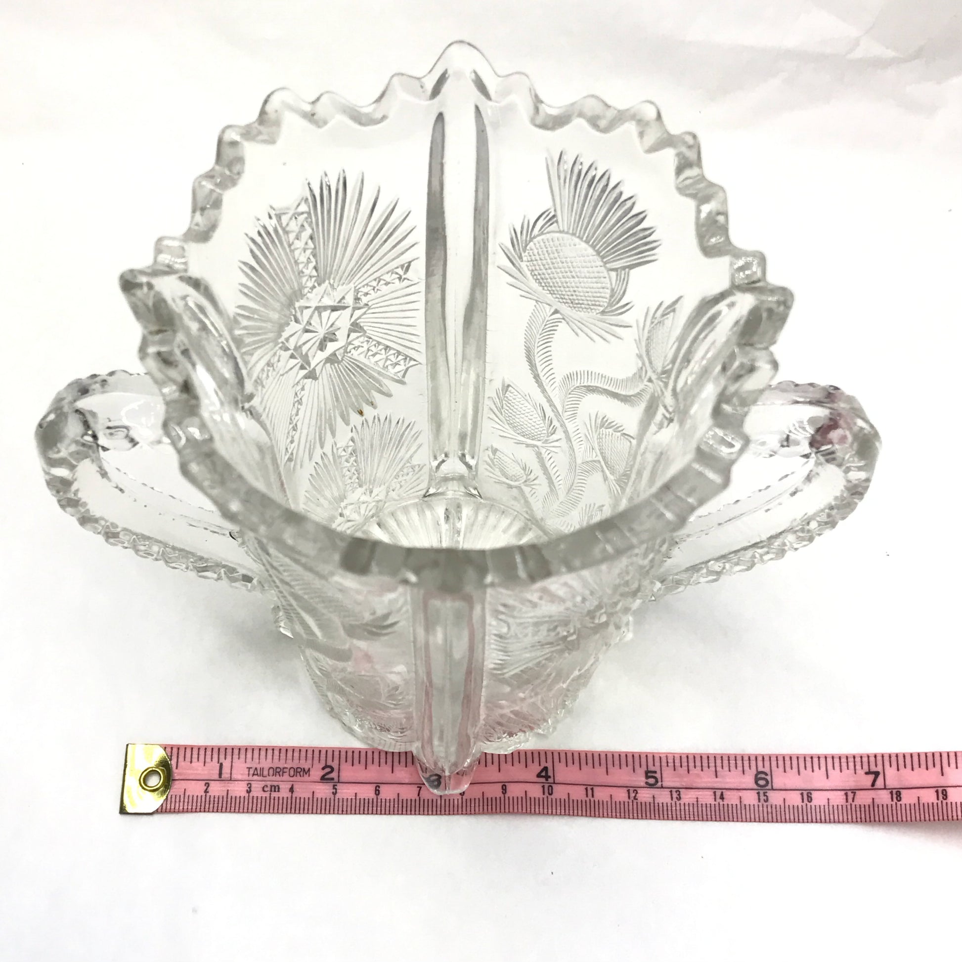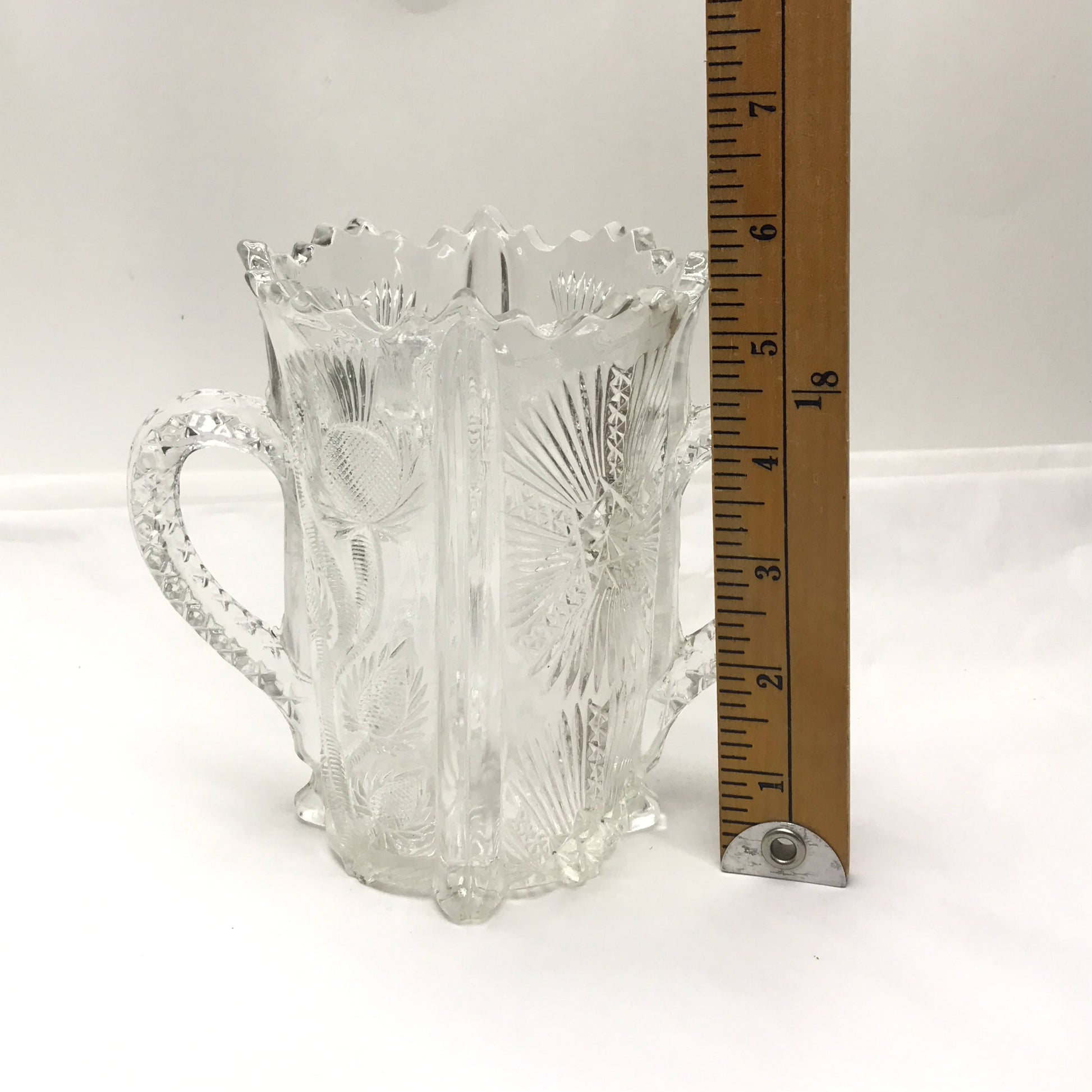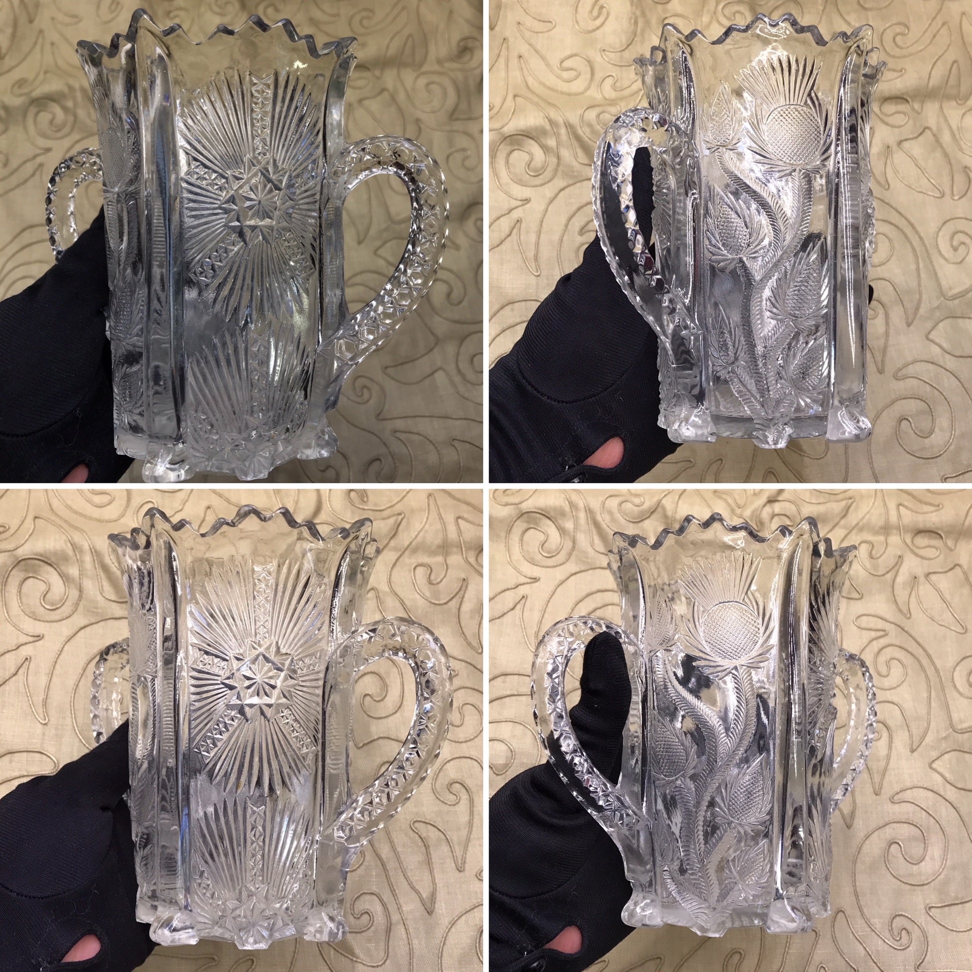 This pressed glass spooner features a thistle design and an elaborate starburst design on each side with terrific seemed double handles. The piece is attributed to the Higbee company — makers of clear pressed glass from the early 1900s.