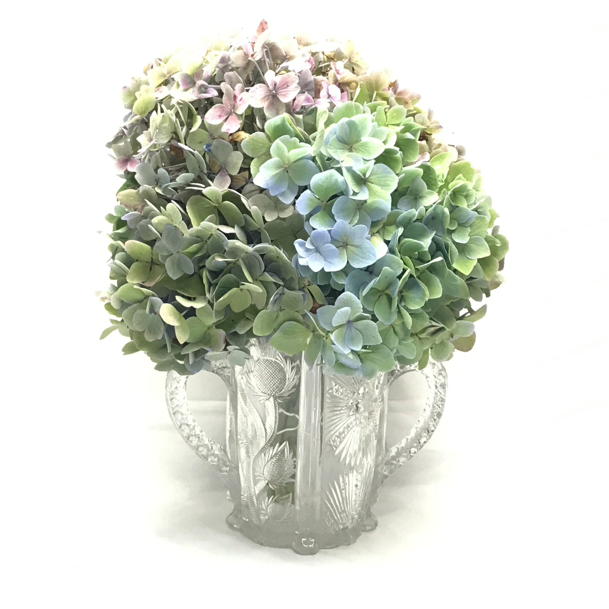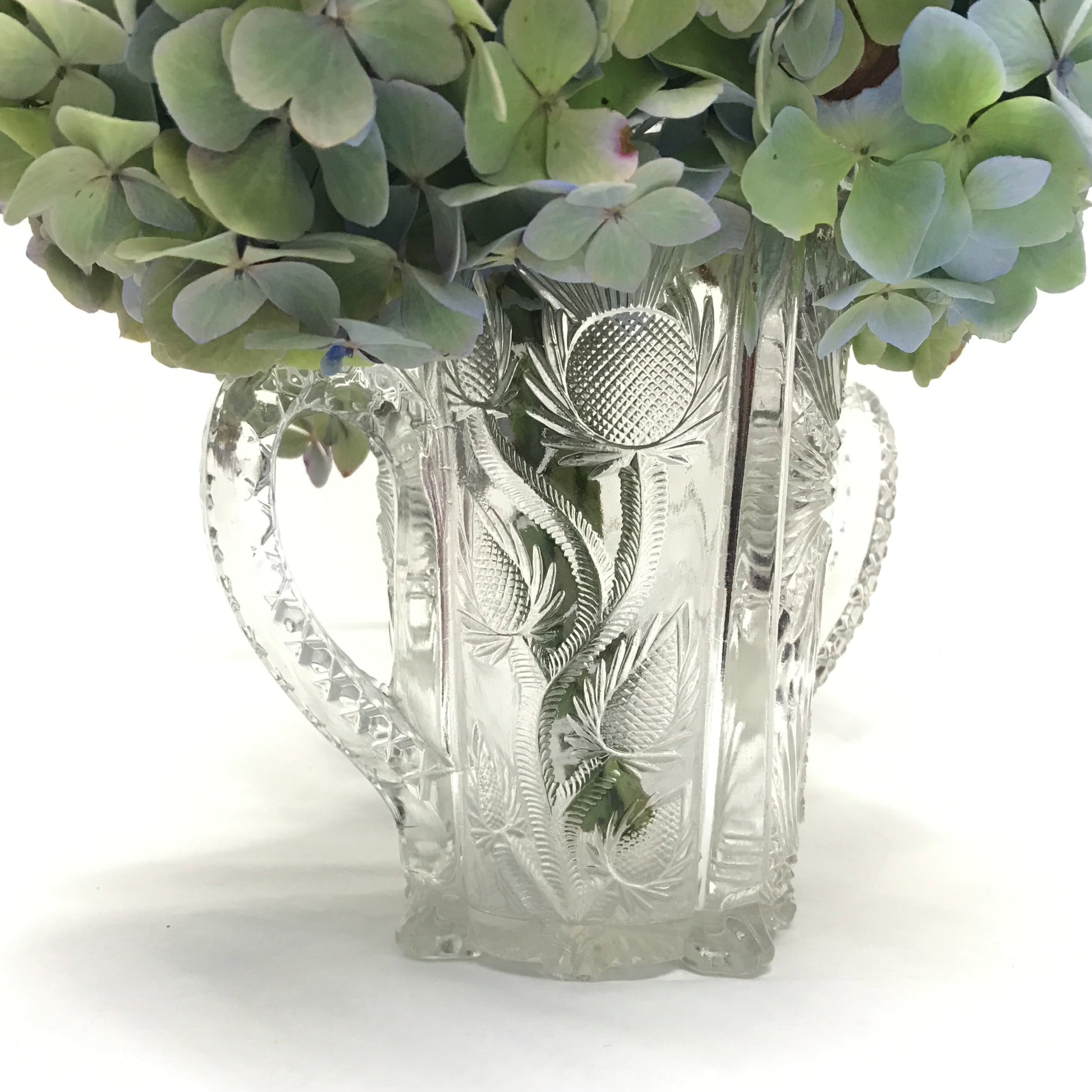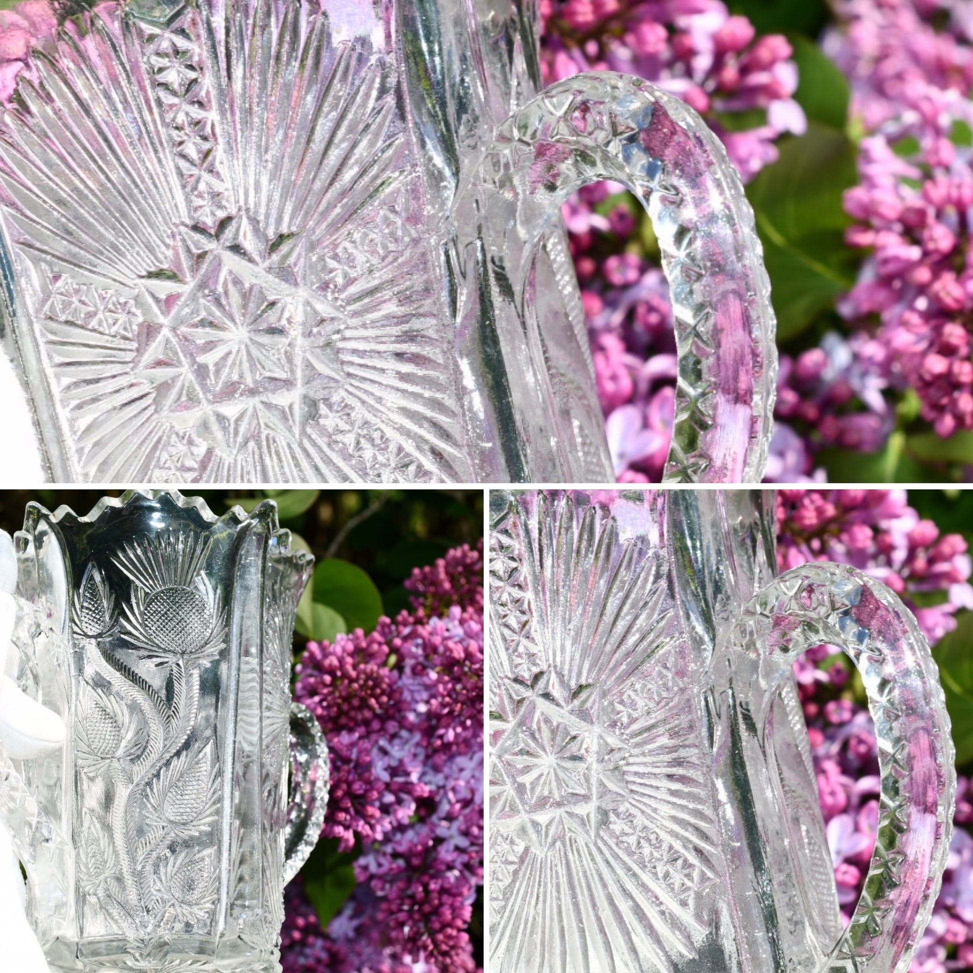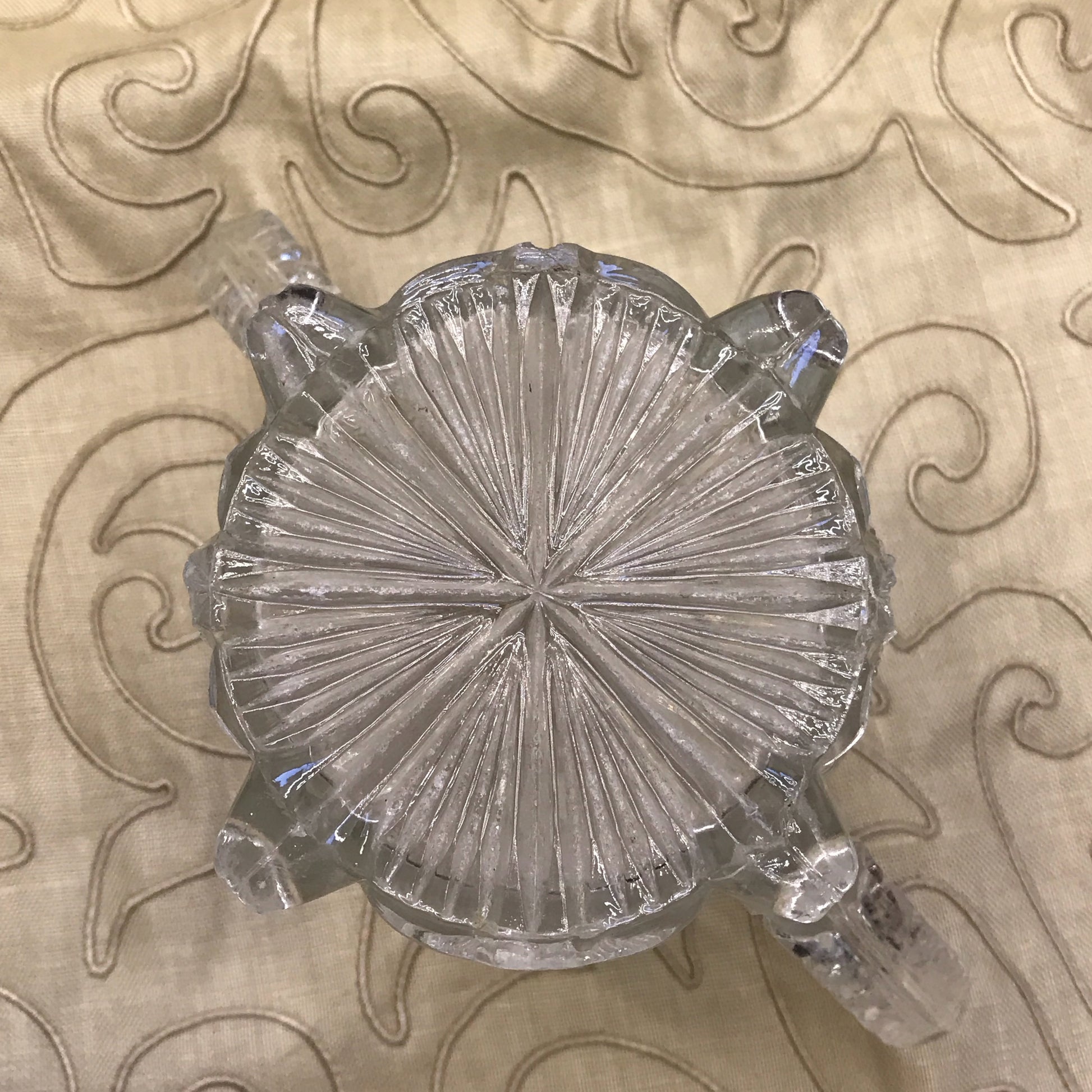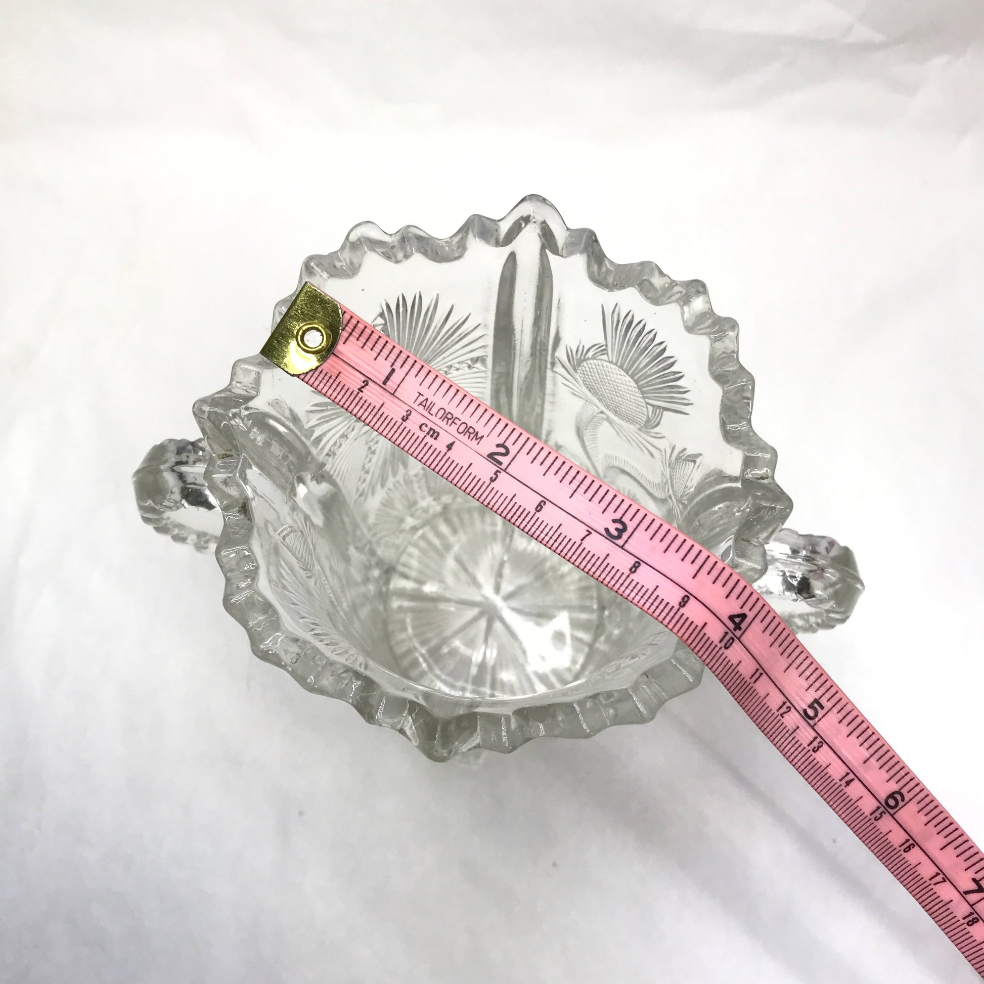 This pressed glass spooner features a thistle design and an elaborate starburst design on each side with terrific seemed double handles. The piece is attributed to the Higbee company — makers of clear pressed glass from the early 1900s.