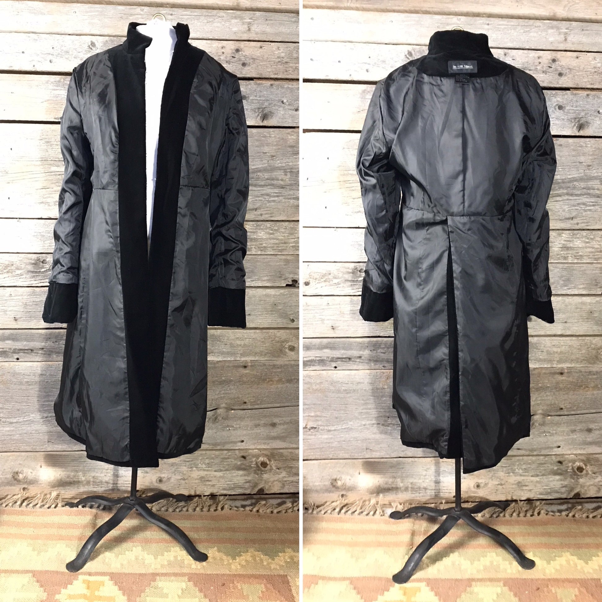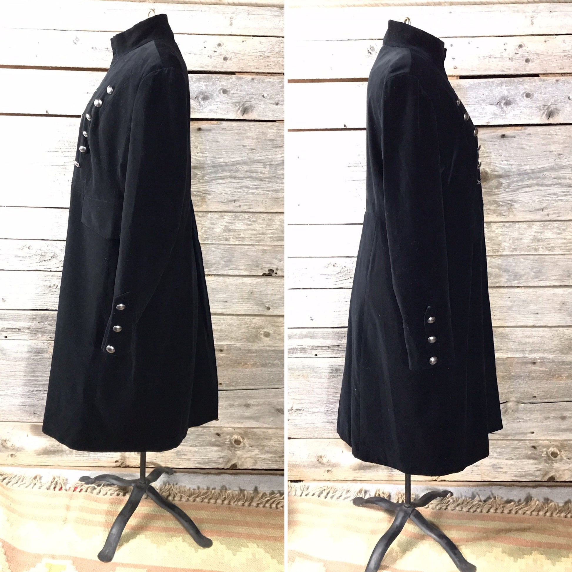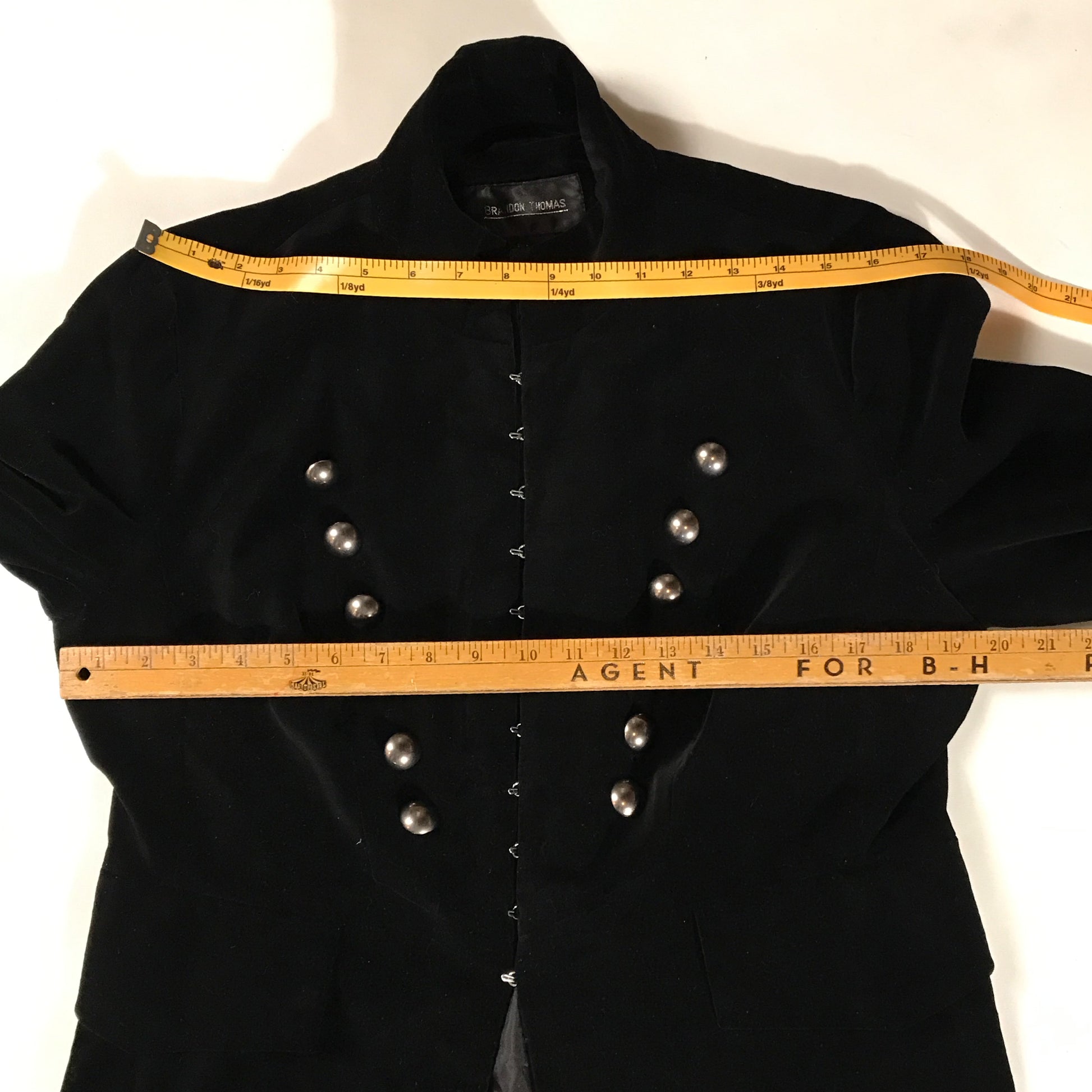 The BRANDON THOMAS Black Coachman’s Coat is a timeless piece that exudes sophistication. Made from luxurious black velvet, this double-breasted coat features two rows of elegant silver metal buttons on the front and matching buttons on the cuffs. The hook and eye clasps add a touch of practicality, while the mandarin collar and long back vent elevate its style. Fully lined for comfort and warmth, this coat is a must-have for any fashion-forward individual.