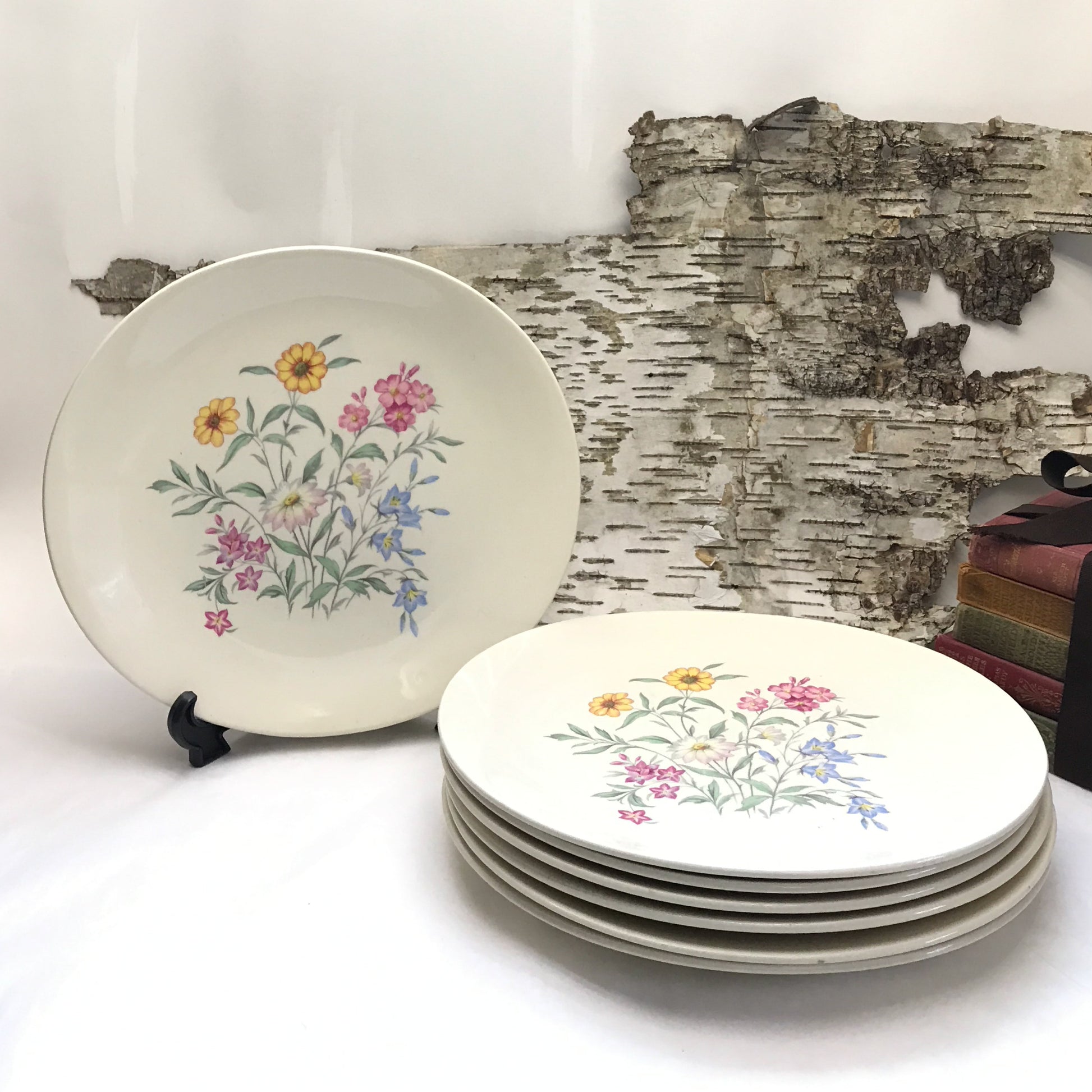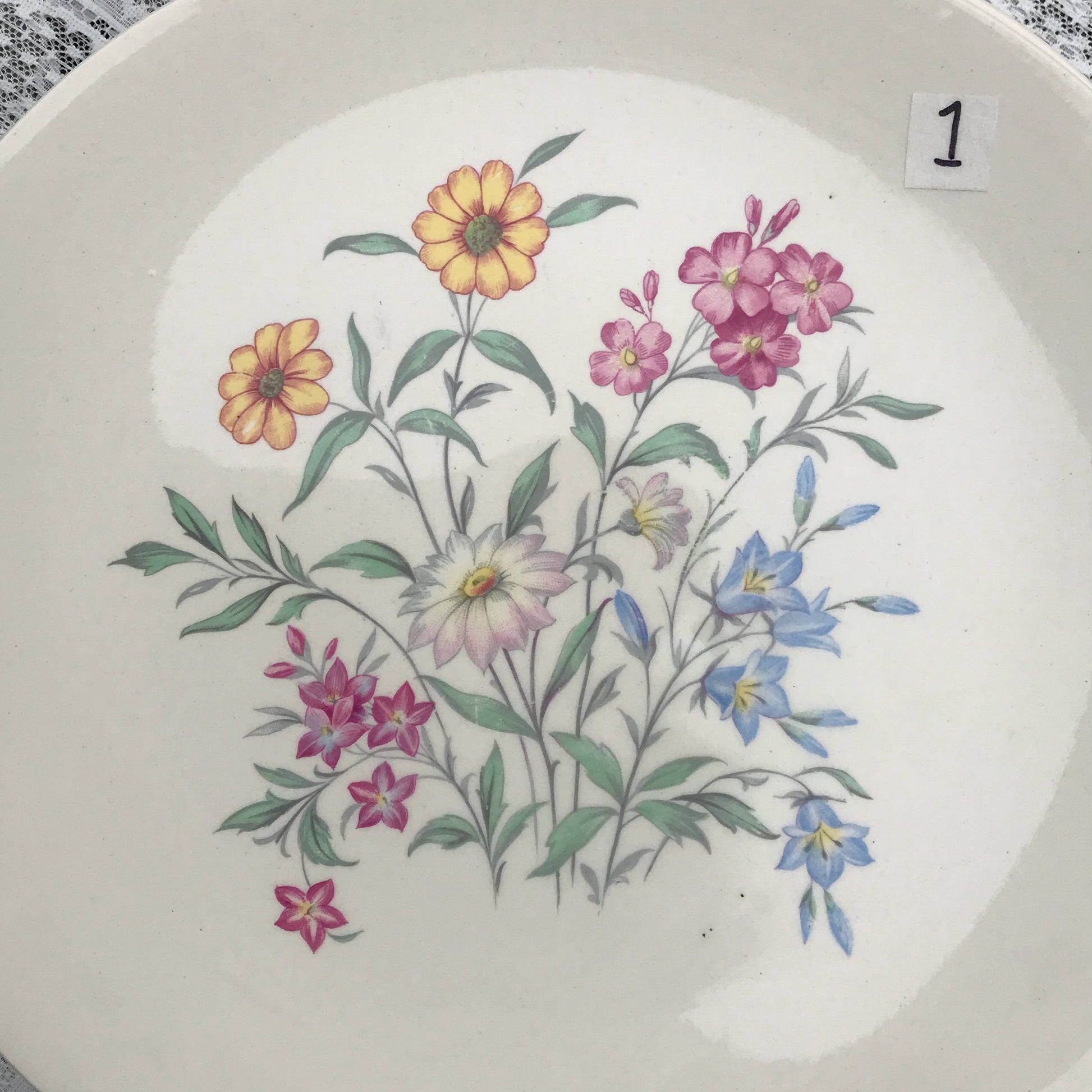 This set of 7 Royal Staffordshire dinner plates designed by notable ceramic artist Clarice Cliff features a large bouquet of wild flowers in the centre. Although the transfer is identical on each plate there are ever so slight differences in the placement of the transfer between the plates. The reverse of each plate bears the pink ink stamp for Royal Staffordshire Clarice Cliff.