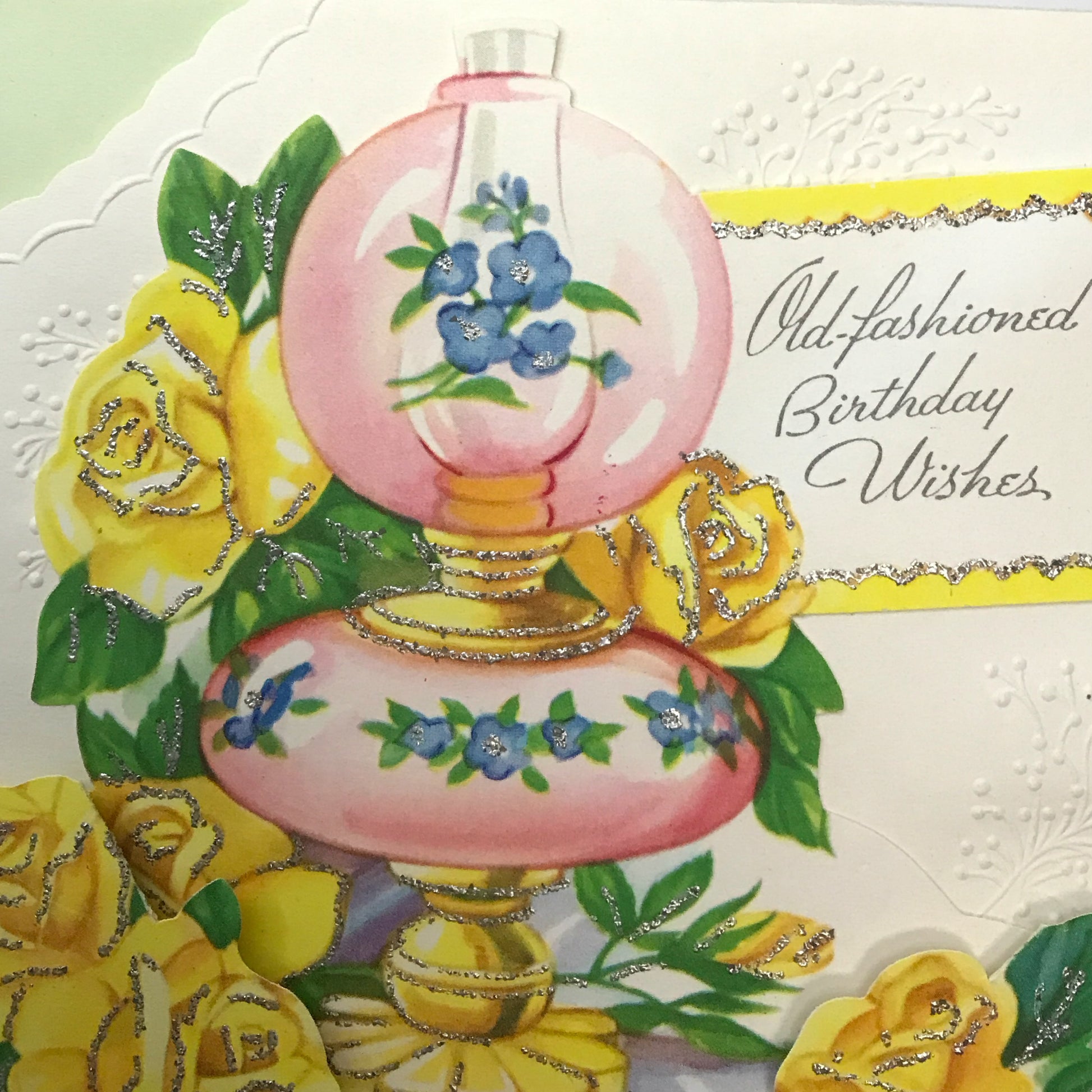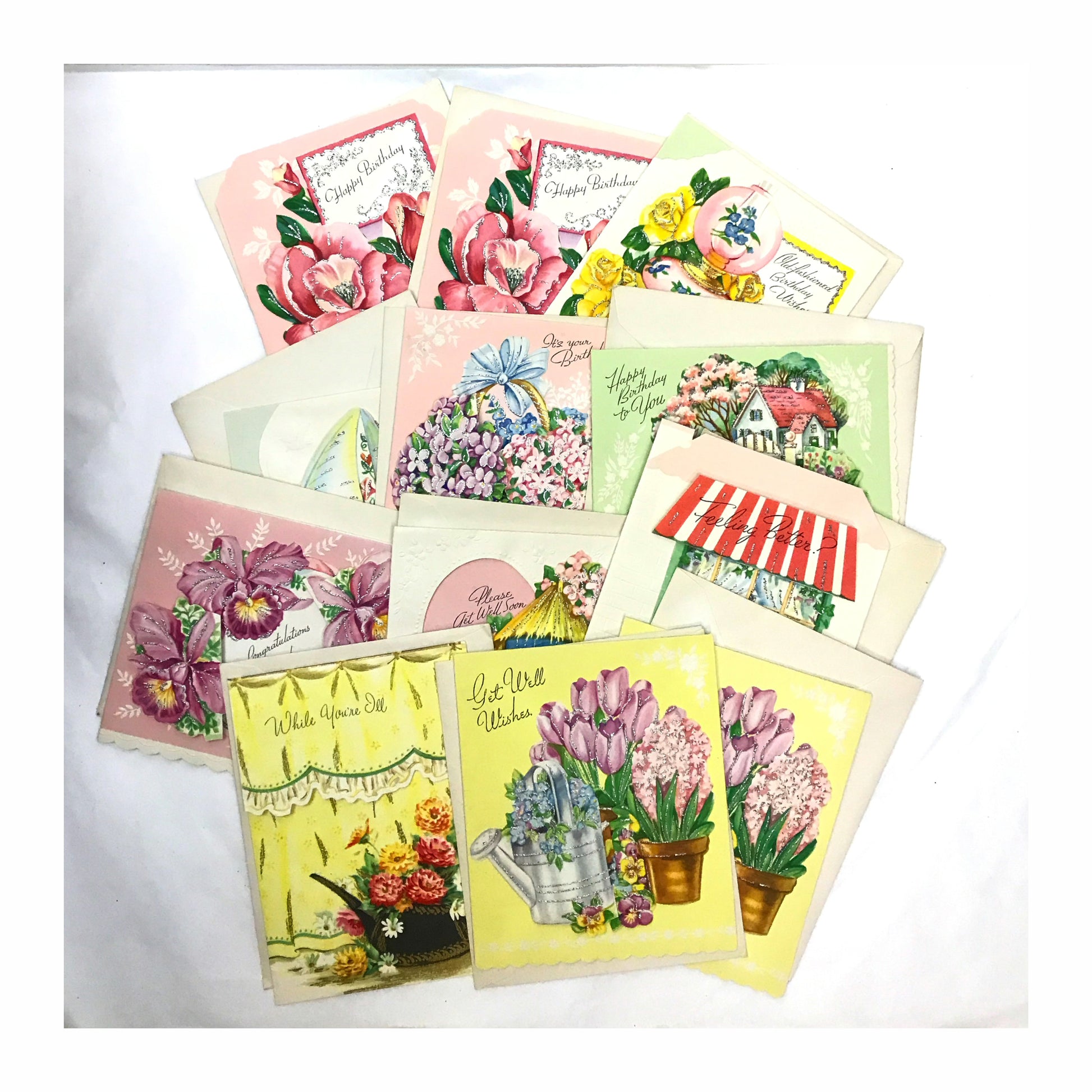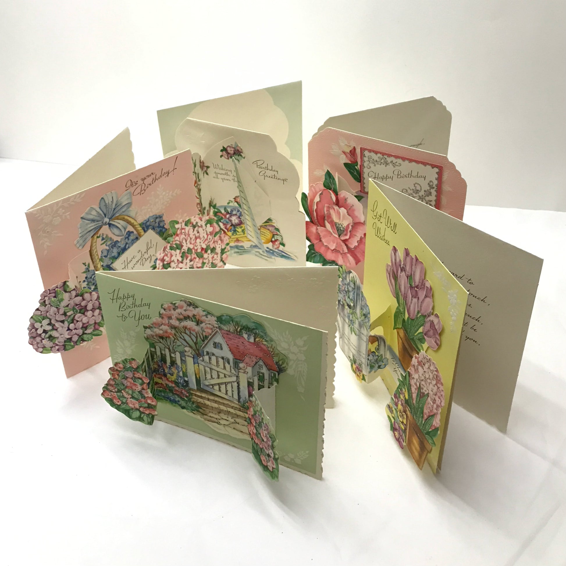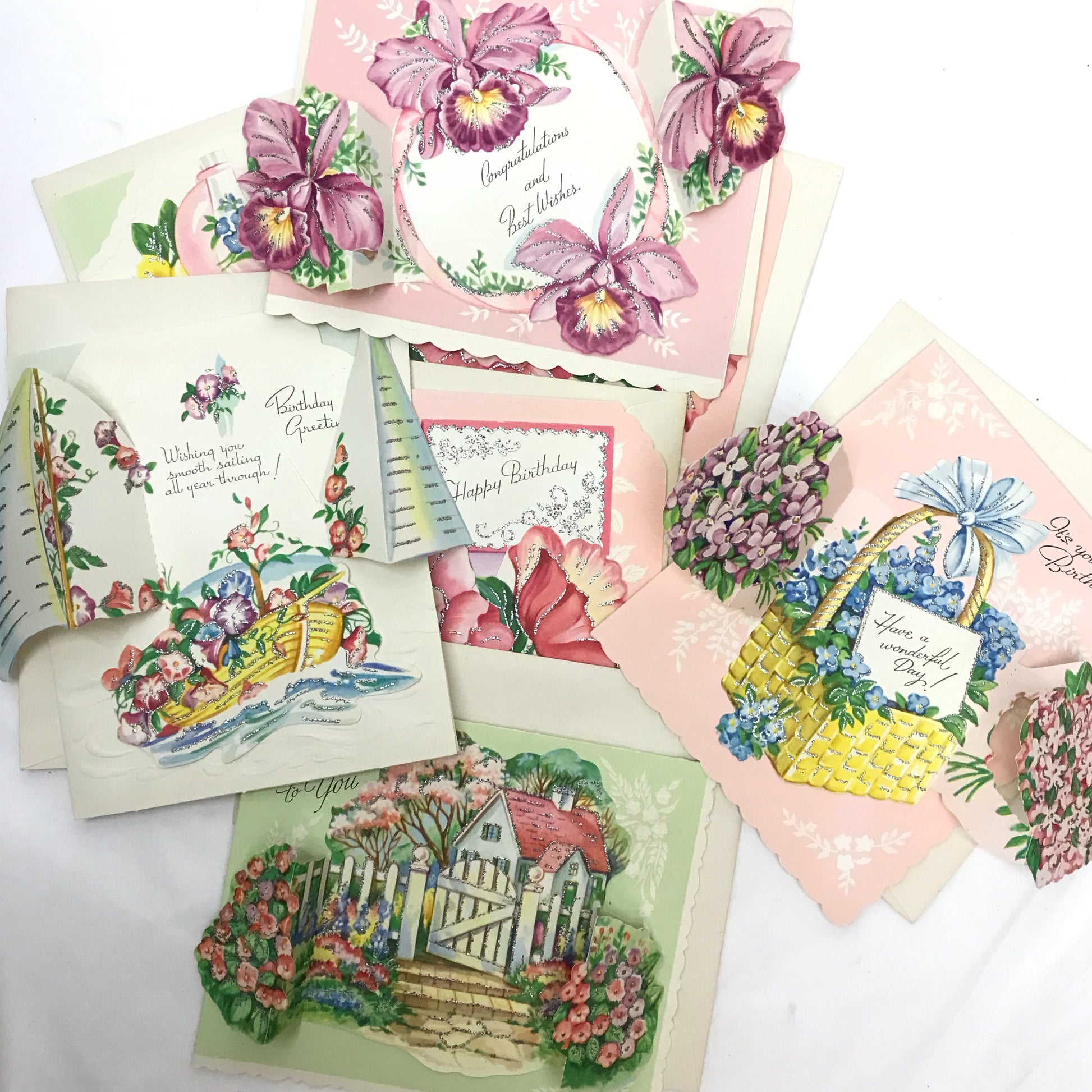 This beautiful lot of die cut vintage cards features 12 cards dating from the 1950s. Most of them pop up to show 3 dimensional scenes with glued glitter accents on their floral themed elements. The cards are clean, unused and were printed in Canada. They are pretty enough to frame or use in scrapbooking or junk journaling projects.