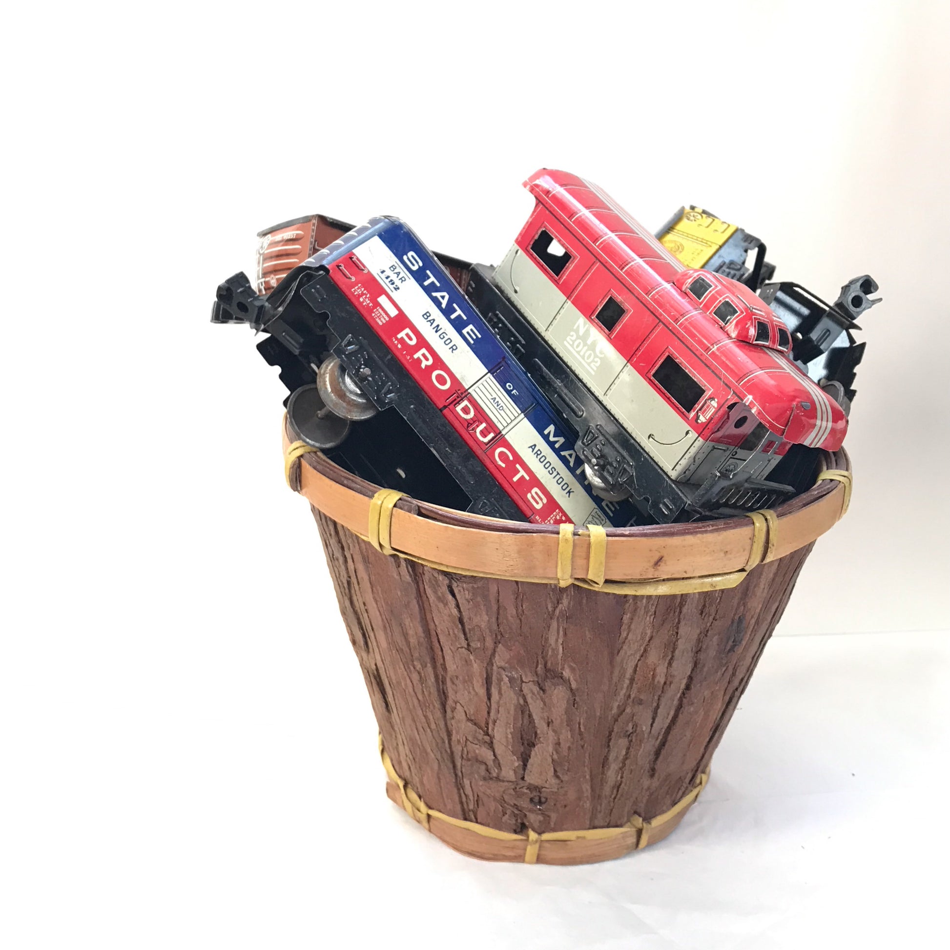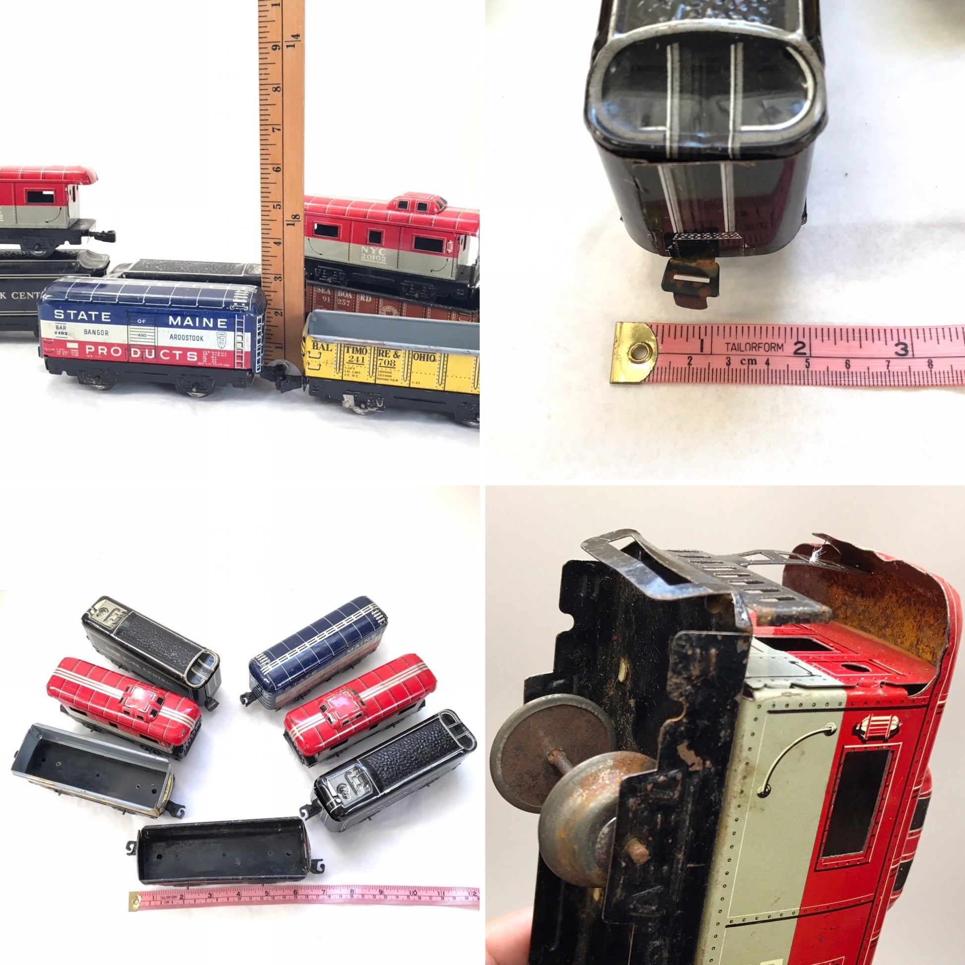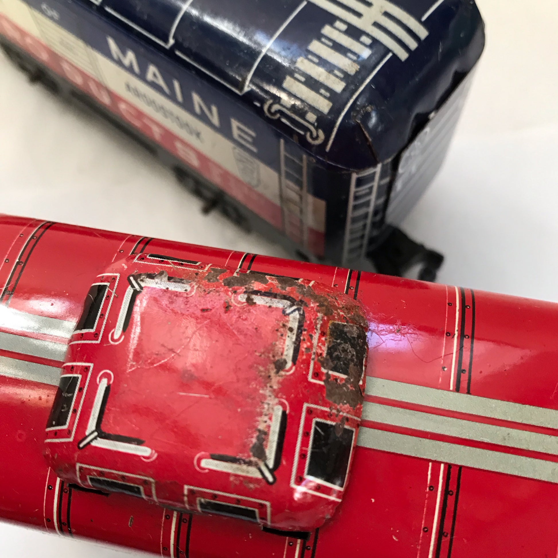 These vintage toy train cars are from a train set made by Marx around the 1950s. The are made from lithographed metal with plastic clips to attach them to each other. The wheels are metal, as well. These pieces have seen a lot of use and have scratches, dents and rusty areas. Examples of this are shown in the pictures. Despite their age, the pieces still have their vibrant paint and look just magical when displayed in a child’s room or in the office or workshop of older children at heart.