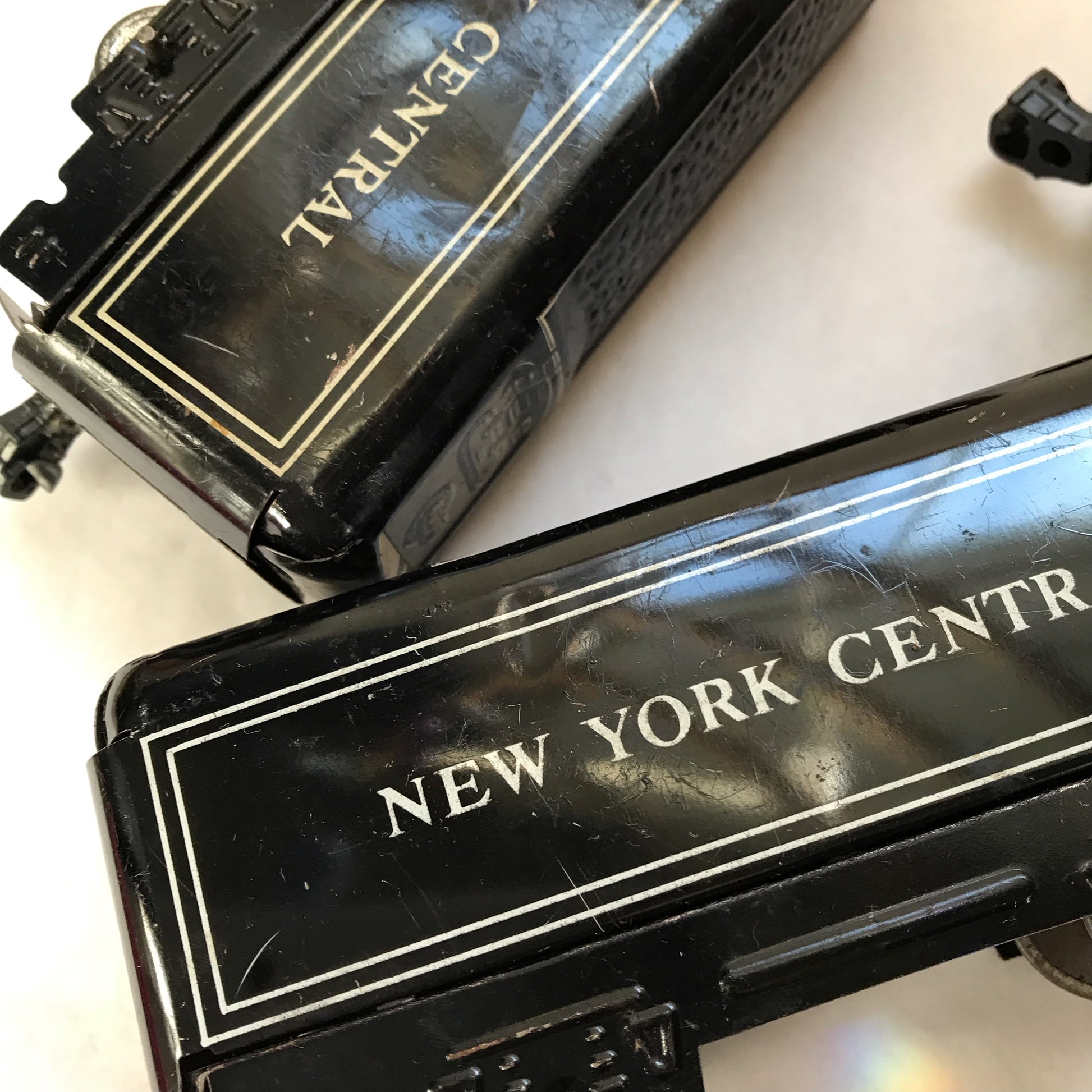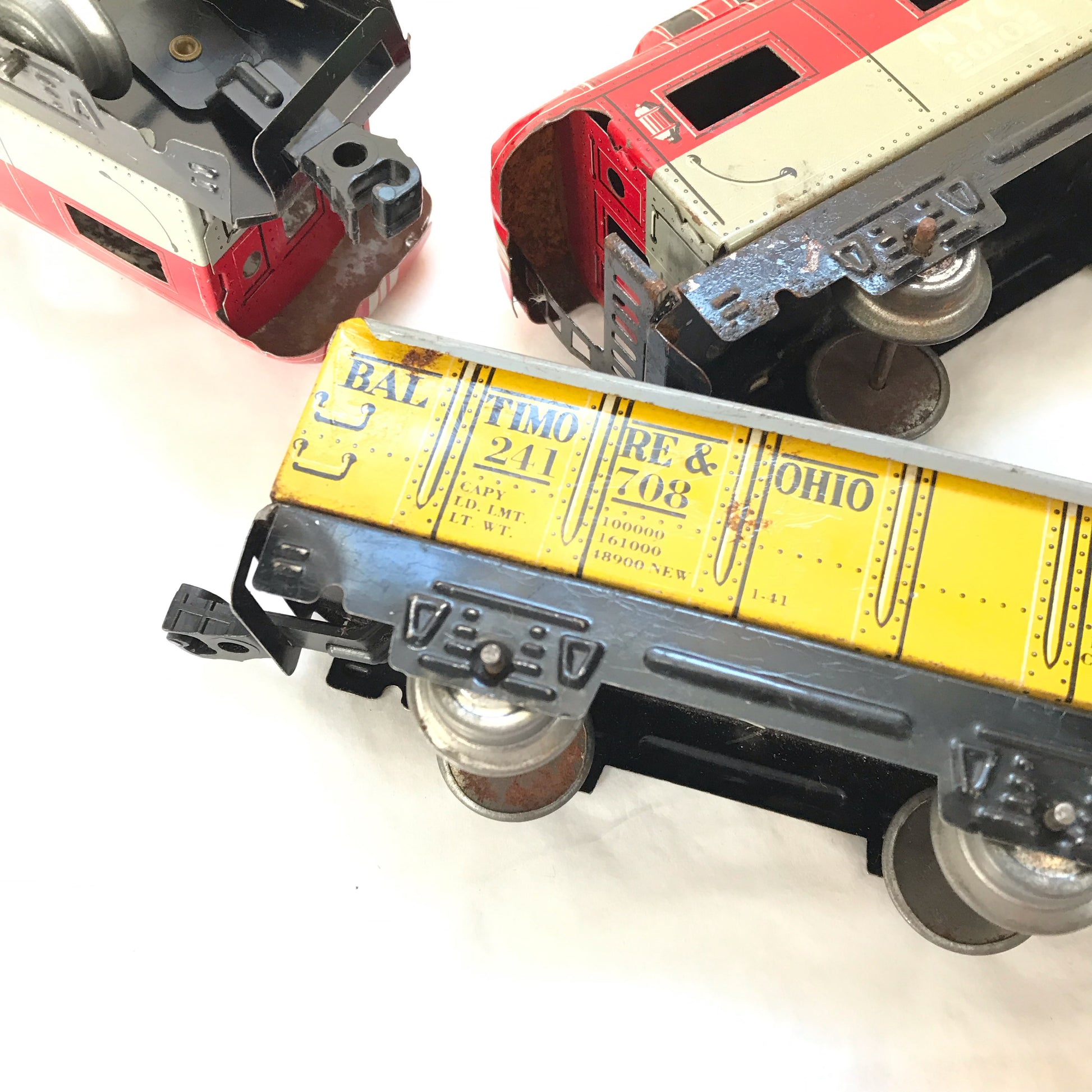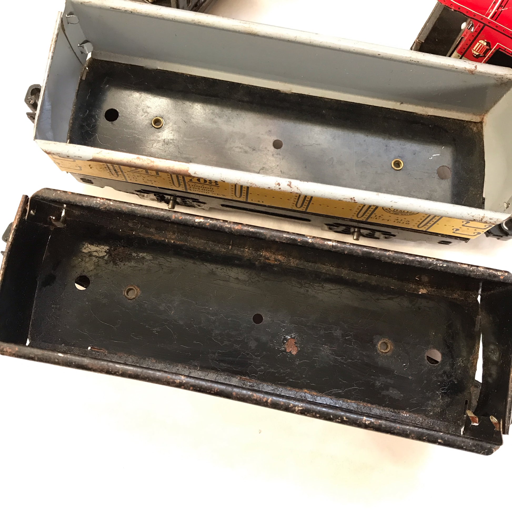 These vintage toy train cars are from a train set made by Marx around the 1950s. The are made from lithographed metal with plastic clips to attach them to each other. The wheels are metal, as well. These pieces have seen a lot of use and have scratches, dents and rusty areas. Examples of this are shown in the pictures. Despite their age, the pieces still have their vibrant paint and look just magical when displayed in a child’s room or in the office or workshop of older children at heart.