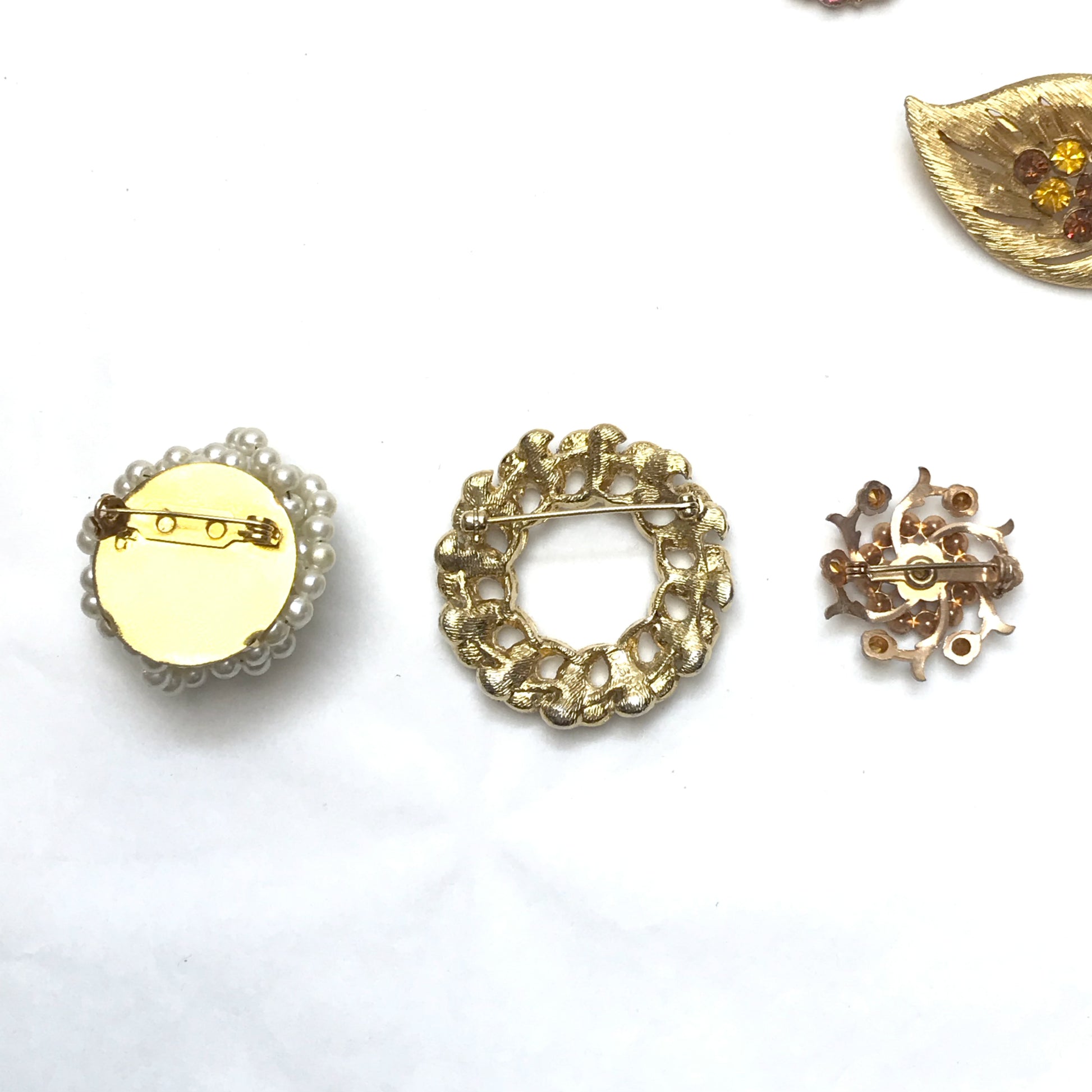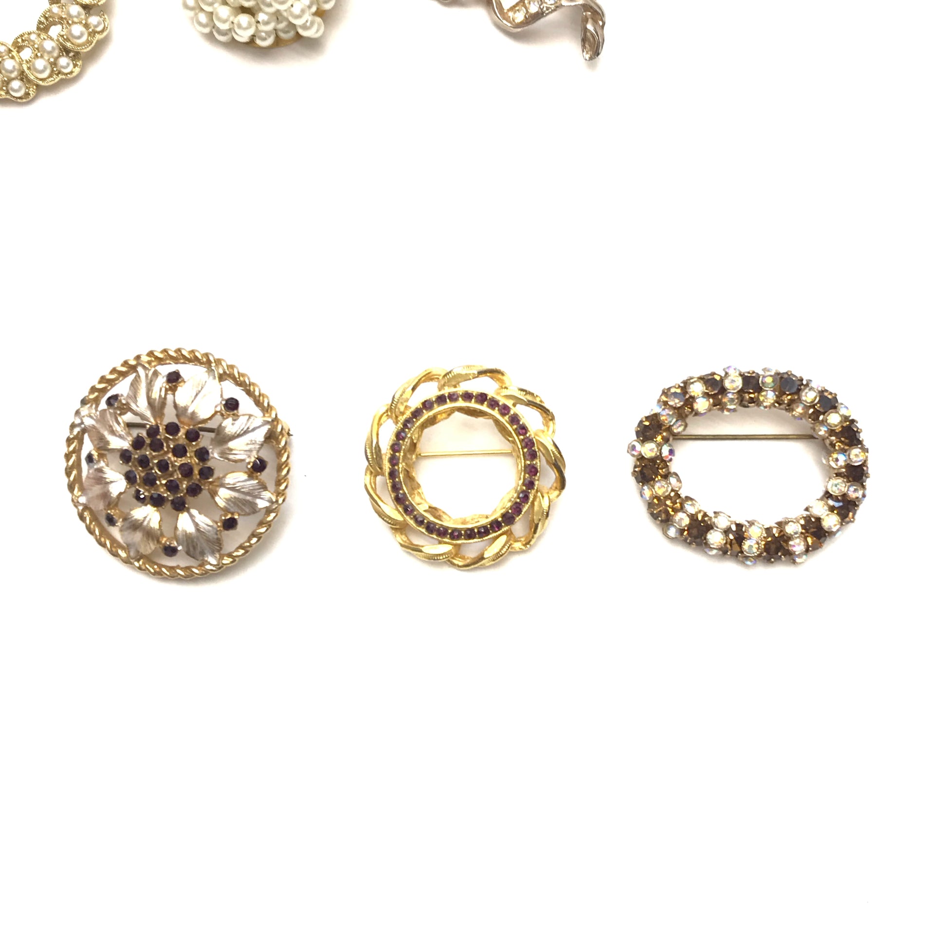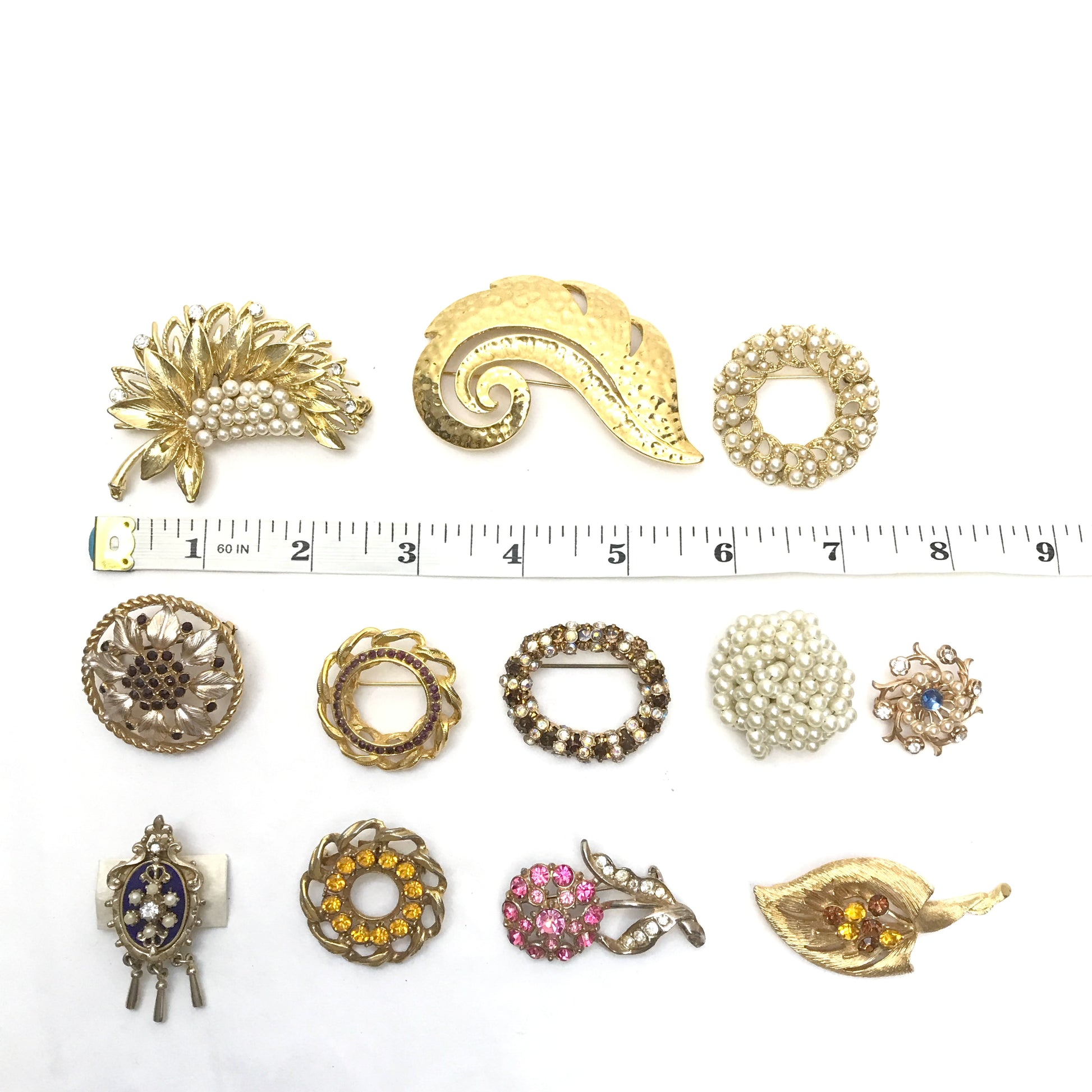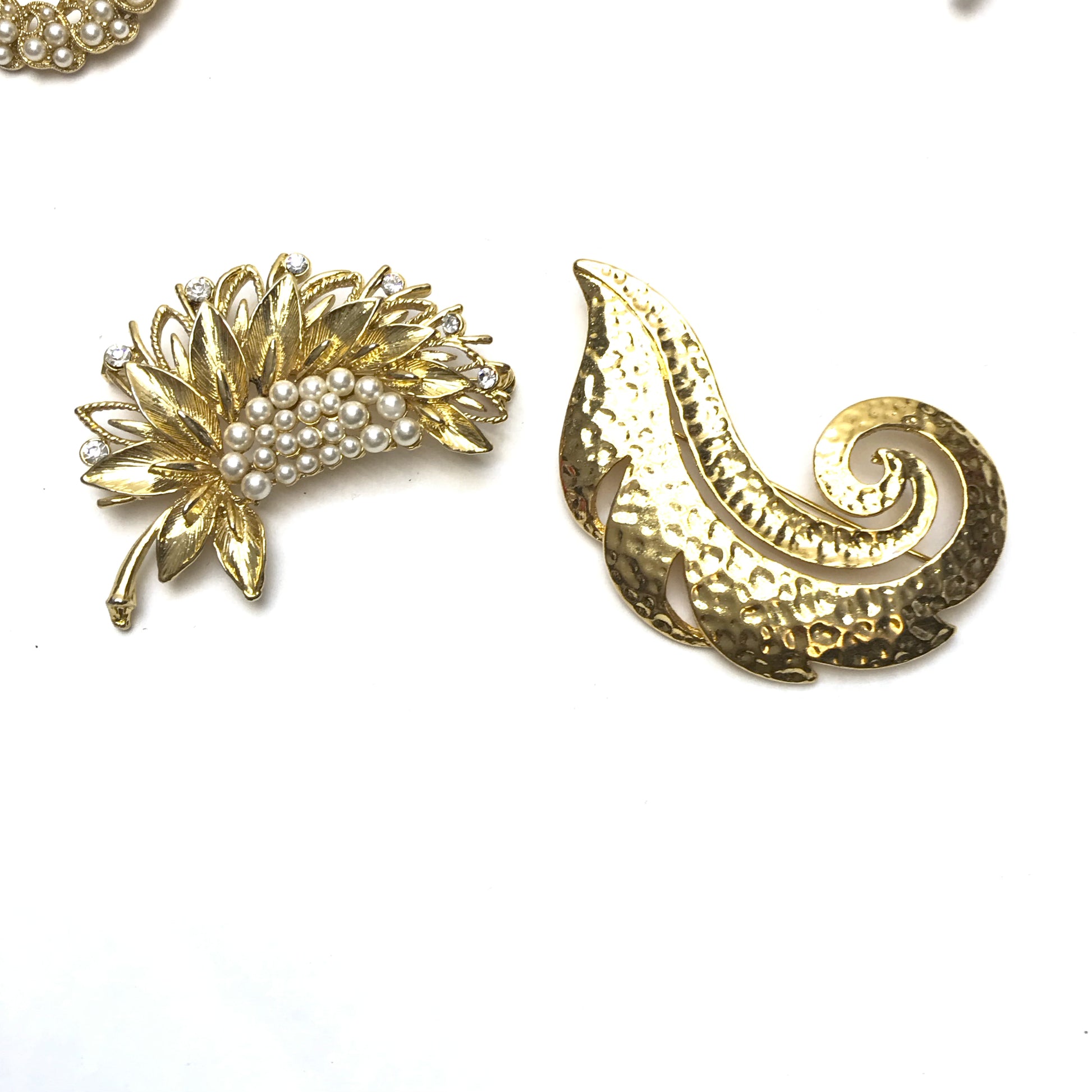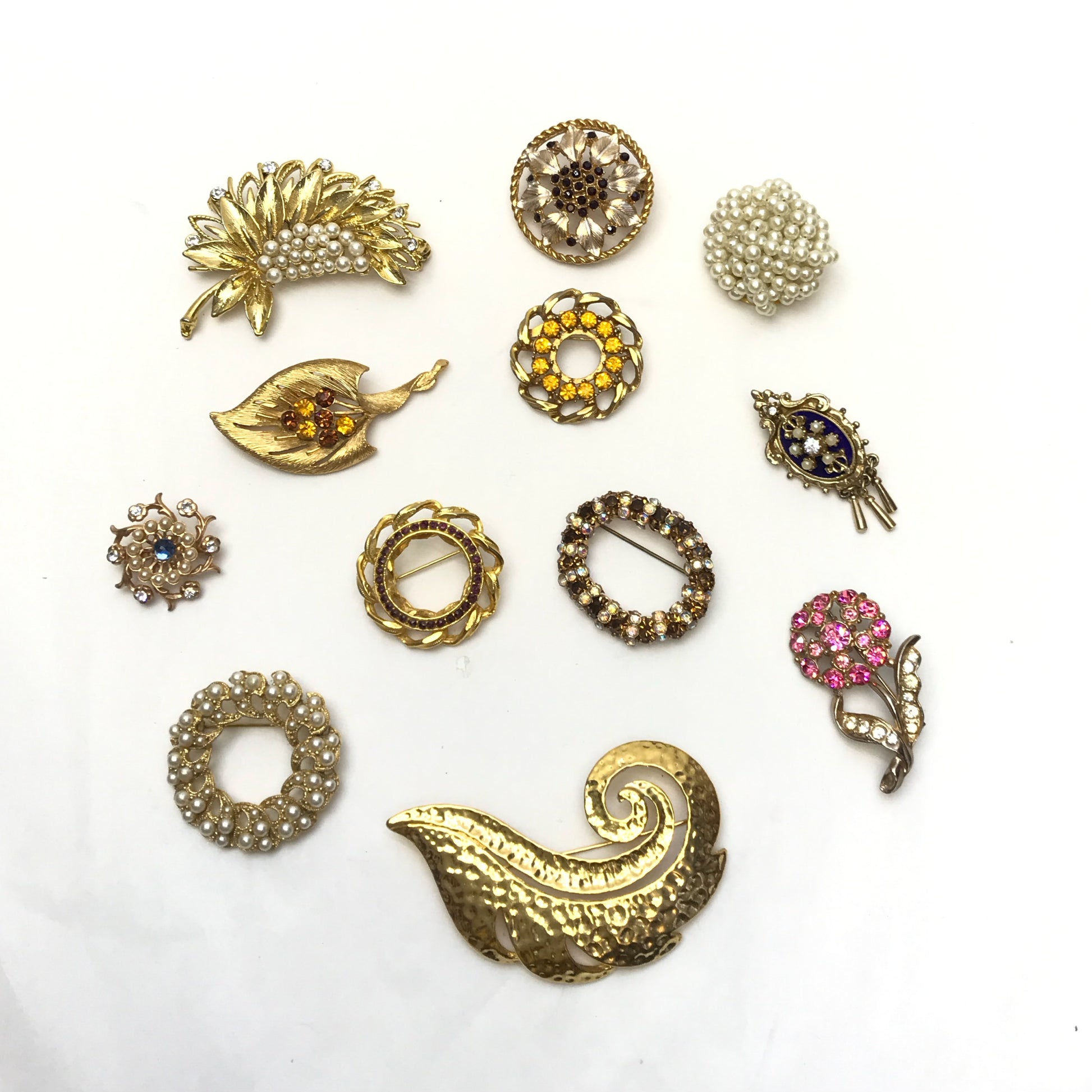 Lot Vintage Brooches, Various Sizes and Shapes, Textured Metal, Faux Pearls,Rhinestones