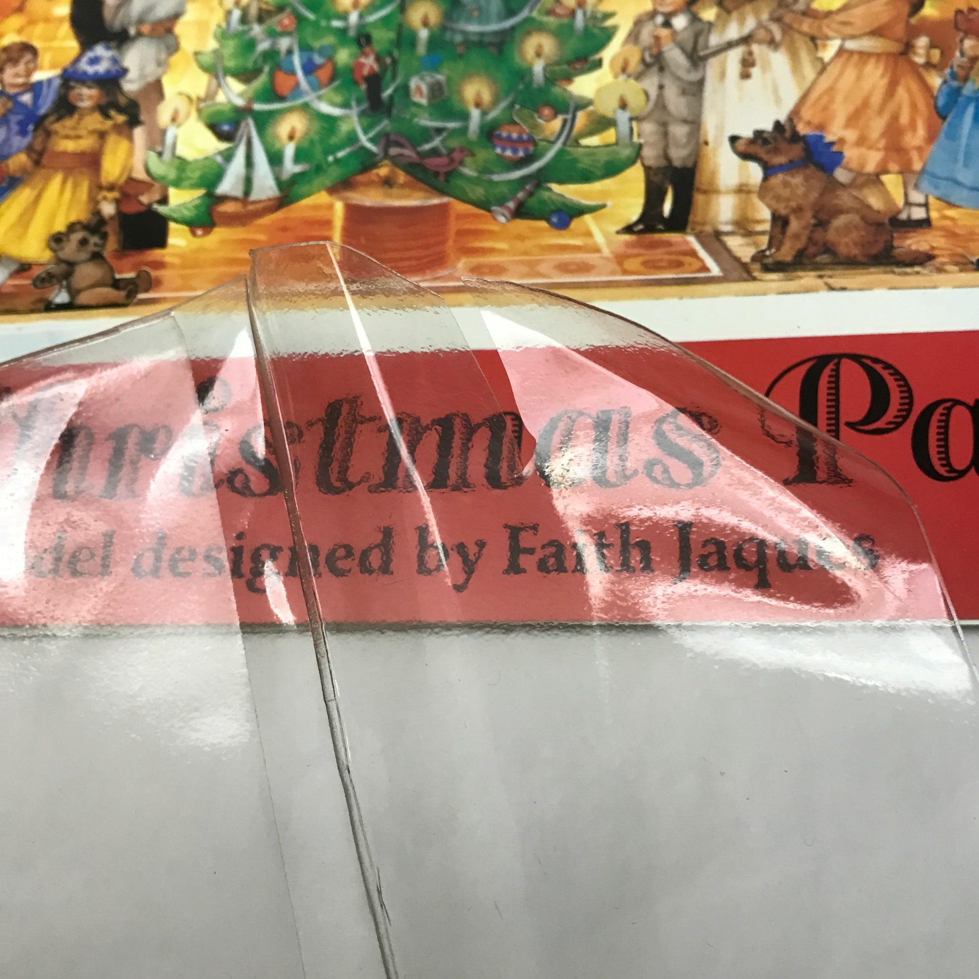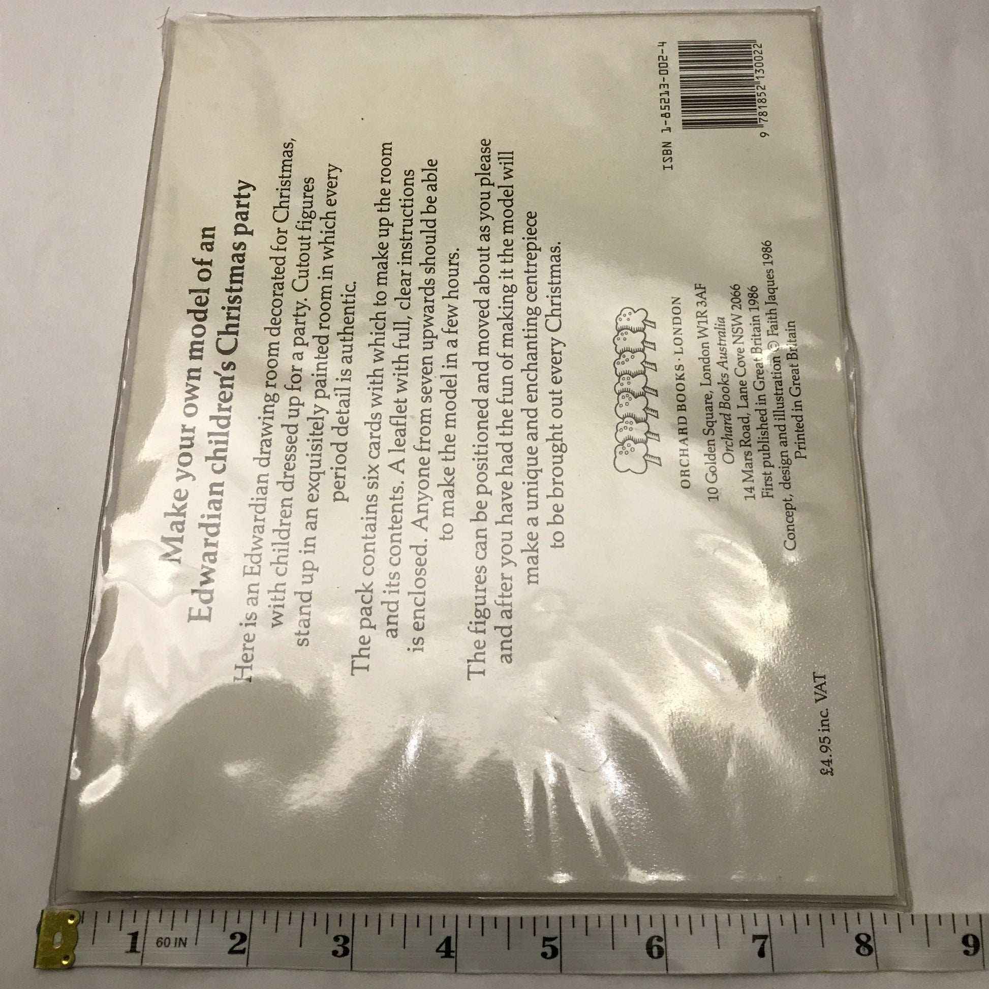 This hard to find 1980s set of cut out paper dolls is titled: The Christmas Party: A Model Designed by Faith Jacques. It was published in England in 1986. The package includes 6 high quality glossy printed 8 X 10 inch cards of cut out pieces, accessories, and characters in order to recreate the scene of a Edwardian family Christmas that is shown on the cover of the package.