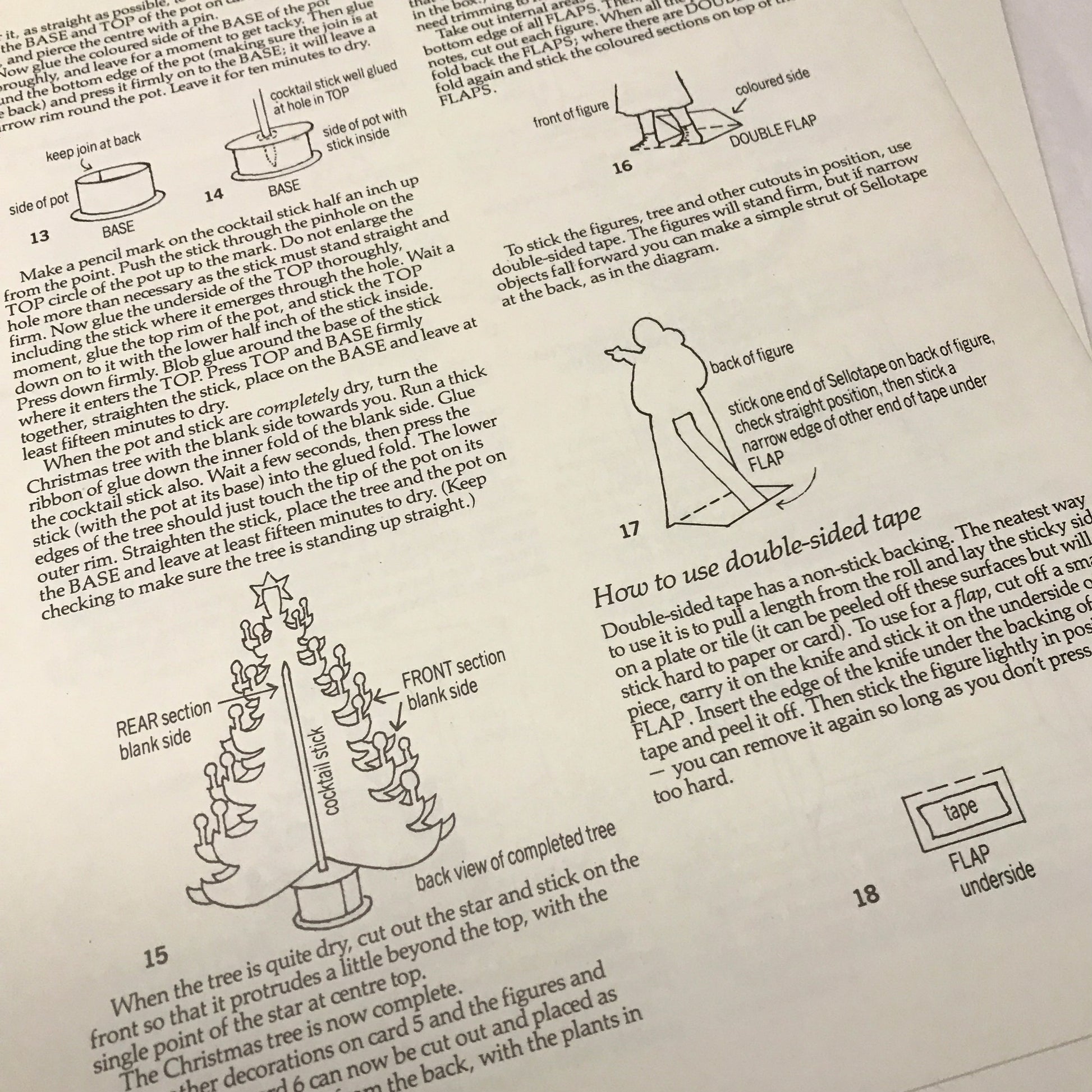 ADDITIONAL MATERIALS: please be warned that in order to assemble the pieces you will need to have some additional items on hand to cut things out and stick them together. There is an extensive list in the instructions that includes the following items: a glue stick, double sided tape, regular scotch tape, scissors, a box cutter, a pin, a ruler, a pen knife, and a cocktail stick (wooden skewer) for the Christmas tree. Reading the detailed instructions is as amusing as assembling the model :)