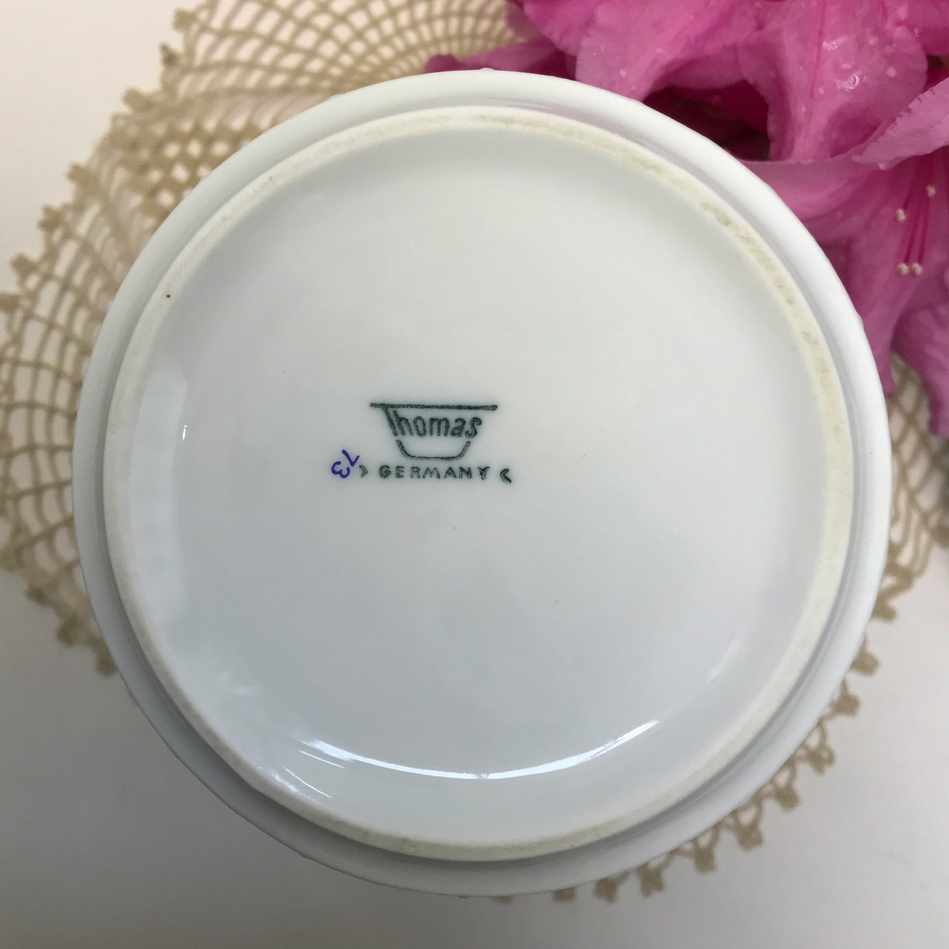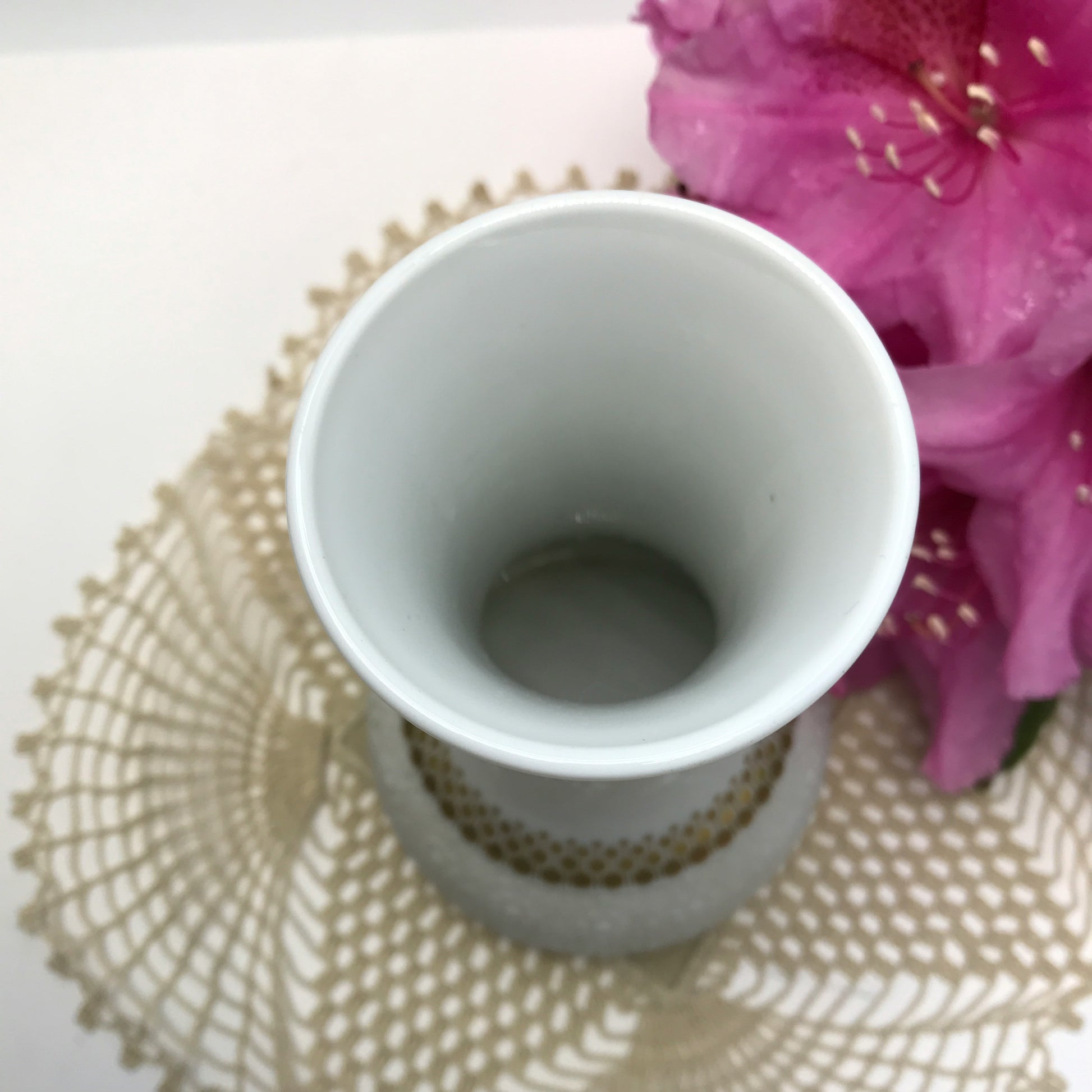 This classic white porcelain vase from Thomas (an acquisition of the Rosenthal company) is the perfect show piece for flowers or other display elements. The vase stands 6.5. Inches tall and has a base of diameter of 3.5 inches. The base is decorated with a subtle yet sophisticated patterned texture with gold painted receding dots.