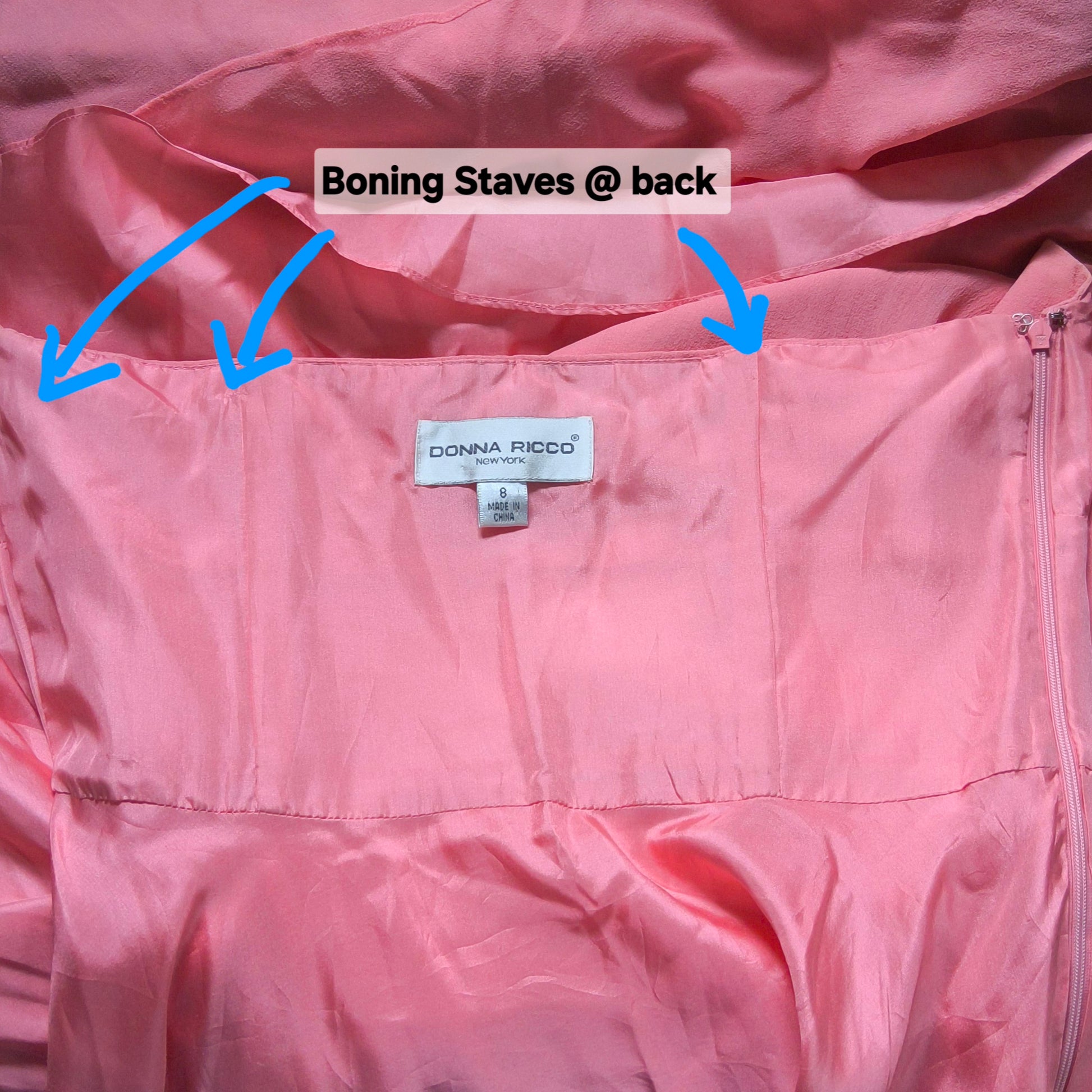 This stunning pink dress with its halter neckline and flowy 2-layer handkerchief hem is giving off some subtle Marilyn Munroe Seven Year Itch vibes. The outer shell is 100% silk crepe that zips up the side and ties at the back of the neck. The piece is fully lined with a generous 100% satin silk full lining. To provide structural support there are staves in the back panel to hold up the delicate silk.